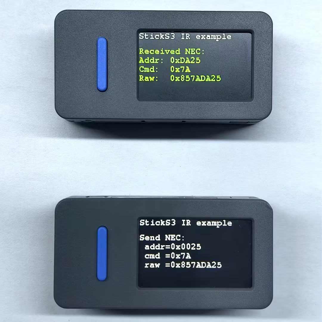 }The transmitter and receiver run on separate StickS3 devices. The transmitter sends an NEC infrared signal every two seconds. After receiving the signal, the receiver displays the address and command on both the serial port and the screen.