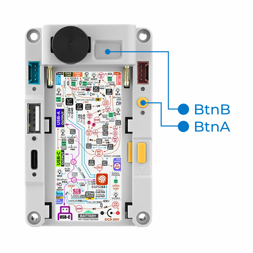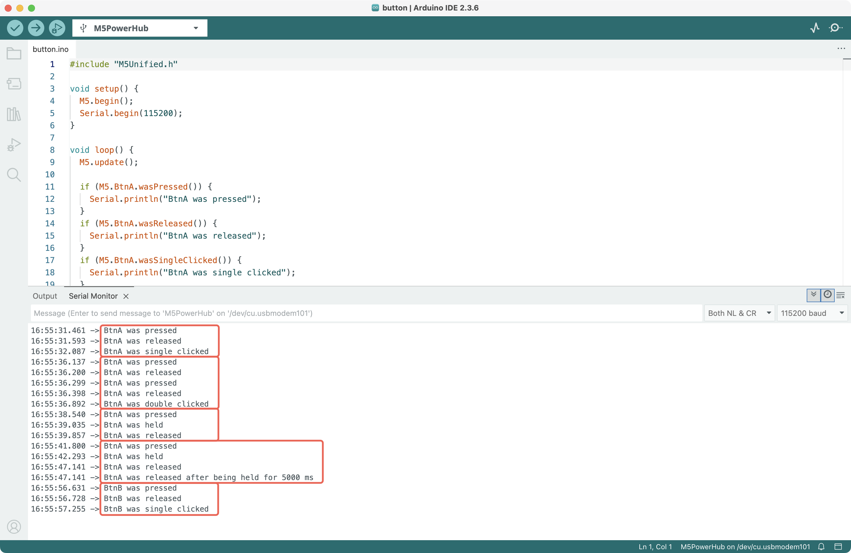 }This program detects the status of two buttons on the device (the yellow round button as BtnA and the rectangular translucent button as BtnB), including states such as pressed, released, single short press, double short press, long press, and release after holding for 5000 milliseconds. The messages are printed in the Serial Monitor: