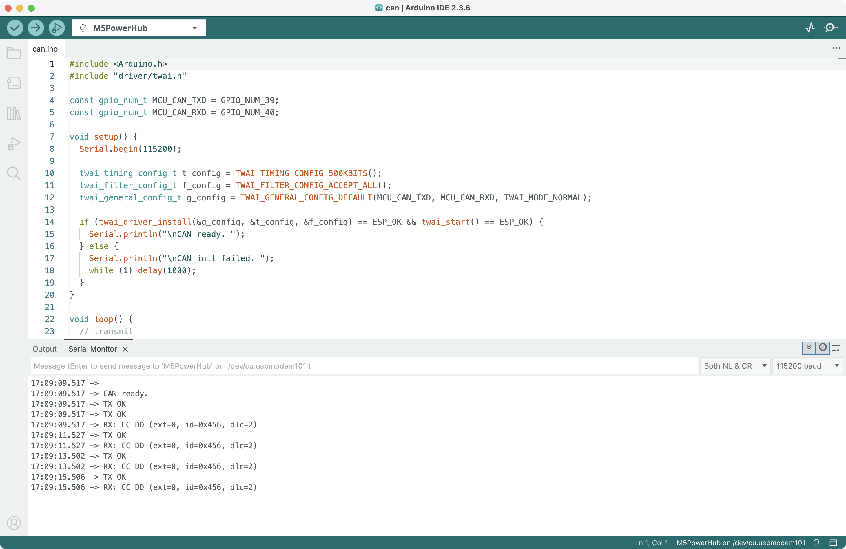 After connecting, the two PowerHub devices will send messages to each other via CAN communication. Connect one of them to your computer and observe the serial monitor output: