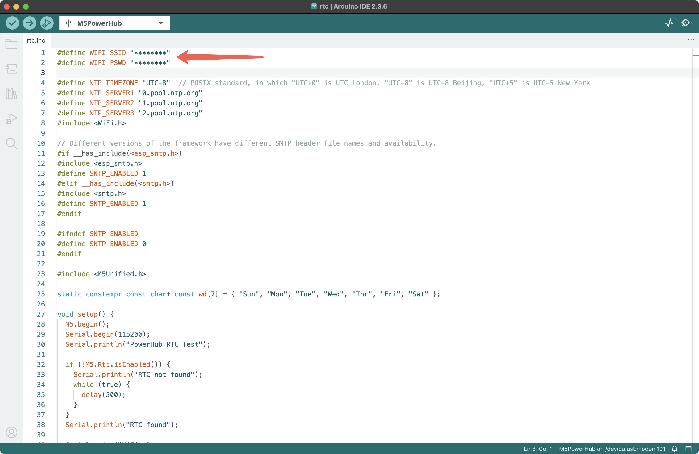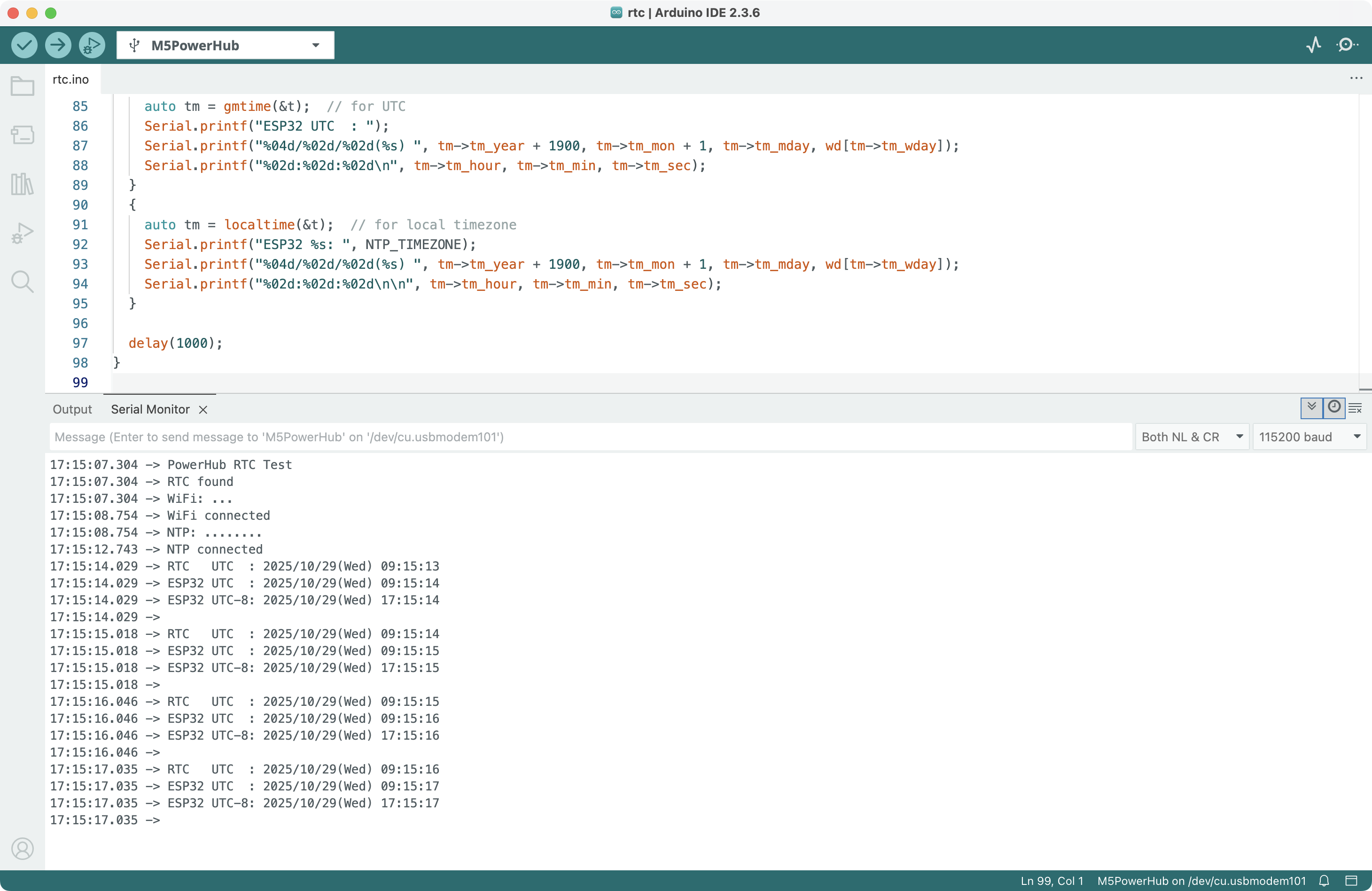 }In the program, fill in the Wi-Fi name and password you want to connect to, as well as your local time zone. Click the Upload button to upload the program to the PowerHub. After uploading, open the Serial Monitor to view the real-time clock.