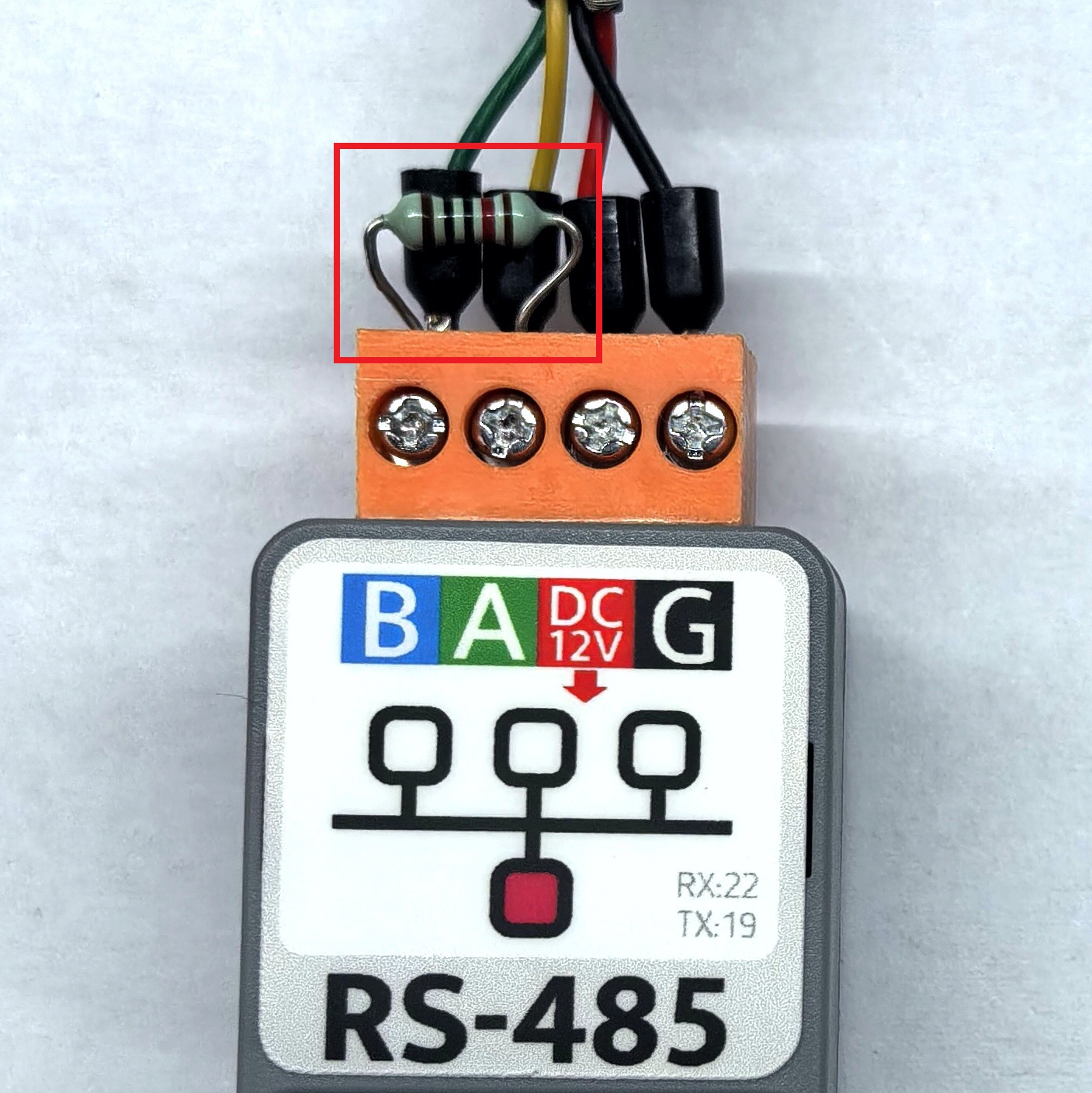 Atomic RS485 Base does not have an integrated 120Ω terminal resistor inside. You can refer to the position in the diagram below to add a 120Ω resistor between the A/B lines.