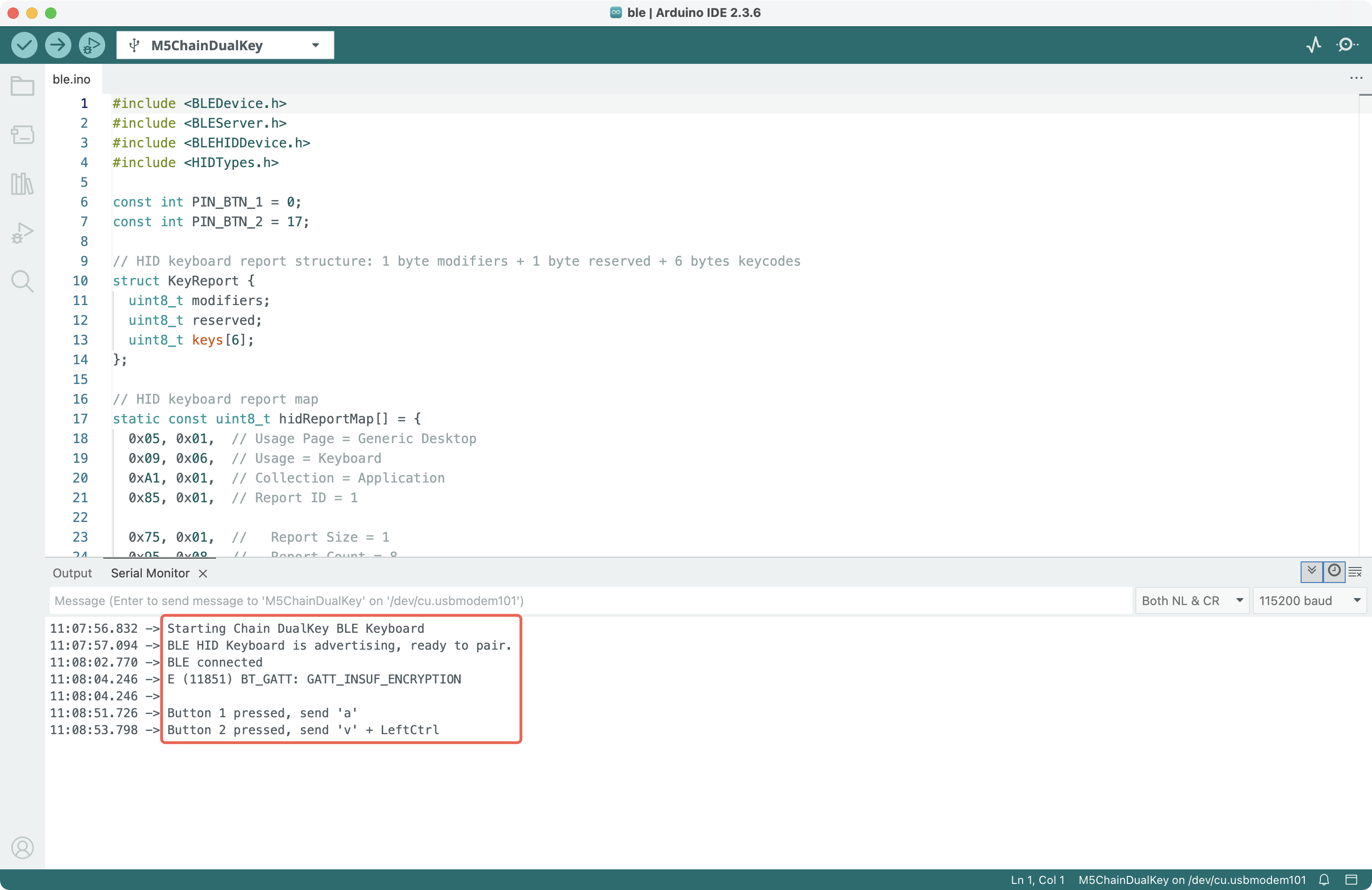 }Copy the code above into Arduino IDE, then compile and upload it to Chain DualKey. After the upload is complete, go to the Bluetooth settings on your PC, phone, or other host device, and pair with the keyboard named Chain DualKey Keyboard. Pressing Key1 will input the letter a, and pressing Key2 will trigger the Ctrl + V key combination to paste on Windows (for macOS Command key usage, refer to the comments in the code).