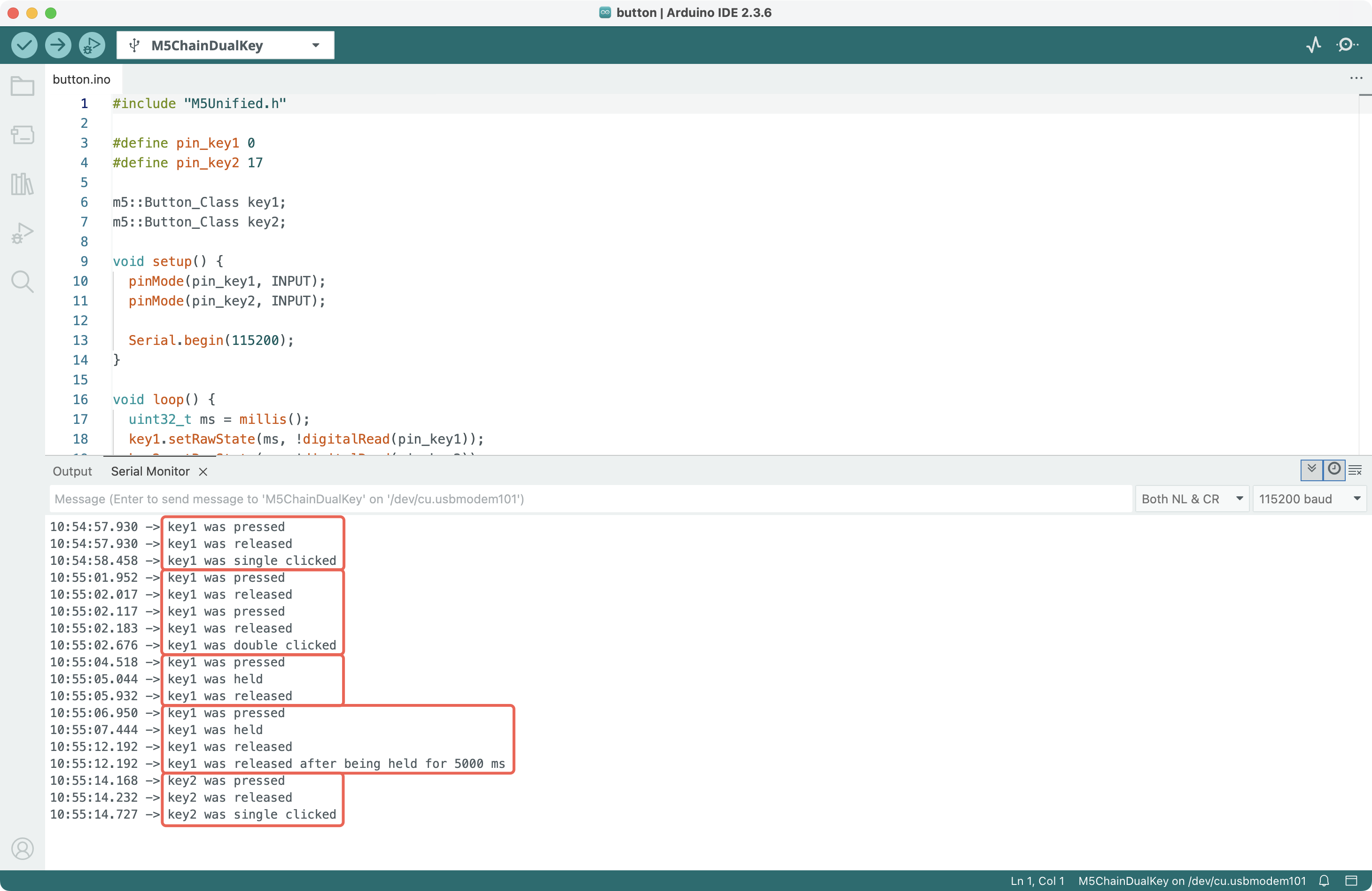 }The program detects the states of the two buttons on the device (the one farther from the lanyard hole is Key1, and the one closer to the lanyard hole is Key2) — including pressed, released, single short press, double short press, long press, and released after a 5000 ms long press — and prints messages to the Serial Monitor.