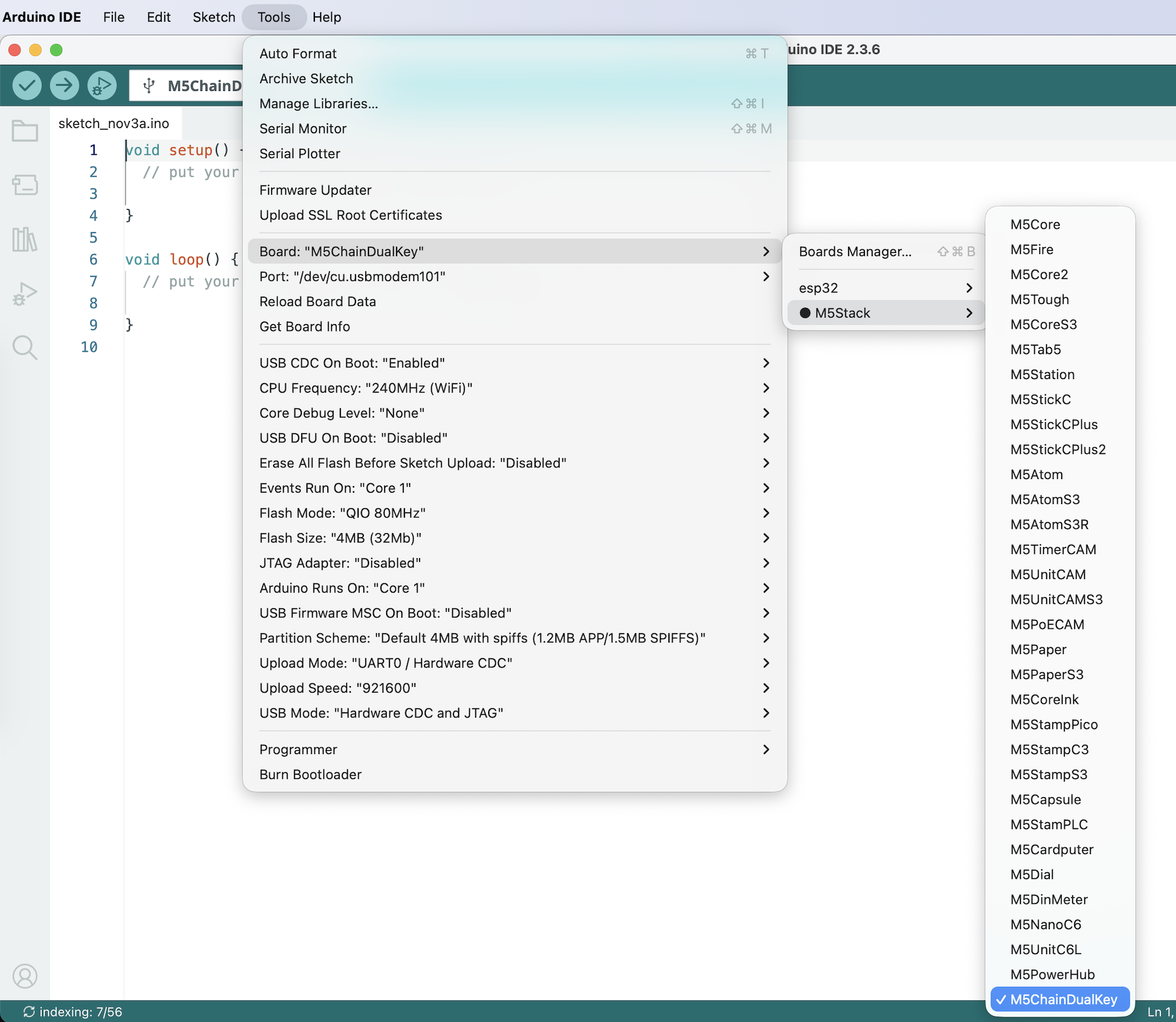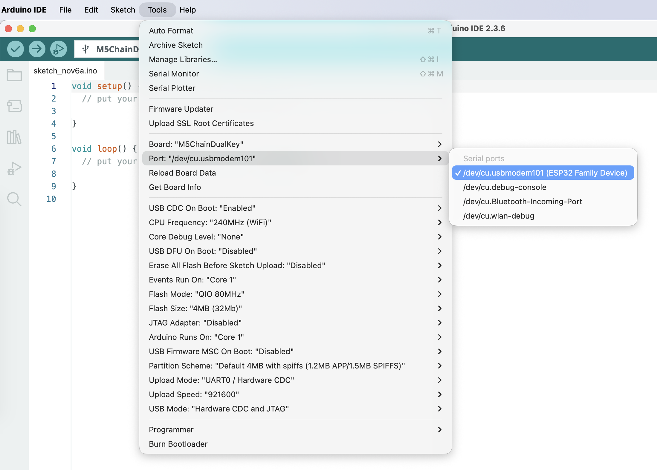 Move the switch to the middle position, hold Key1 (the button farther from the lanyard hole) and connect the device to your PC via a USB-C data cable. Then release Key1, and the device will enter download mode, allowing you to select the correct controller and device port in Arduino IDE.