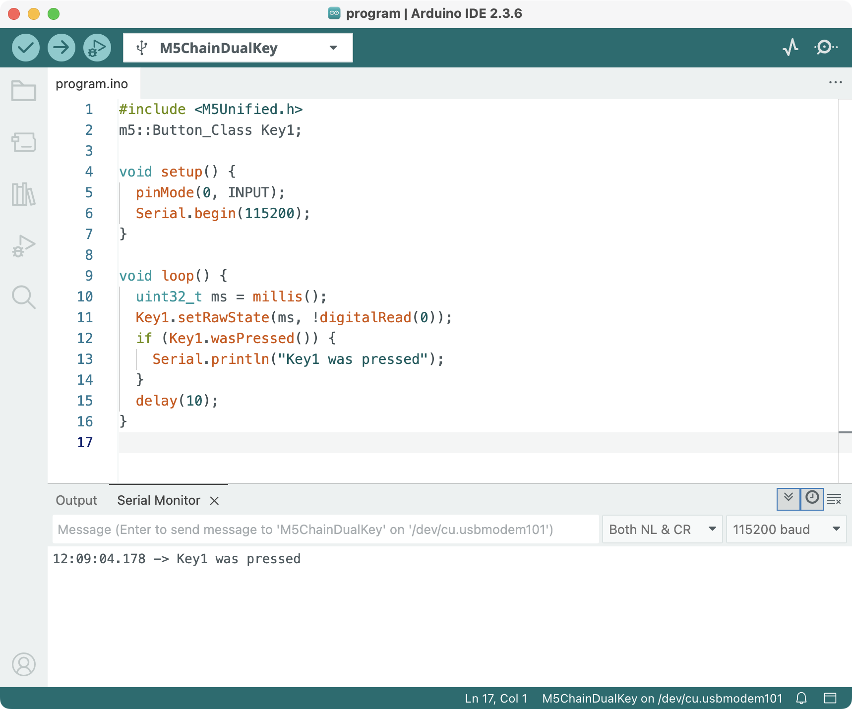 Copy the program above into Arduino IDE, click the Upload button, and once the compilation and upload are complete, open the Serial Monitor. When Key1 is pressed, the device will send a line of text to the serial monitor: