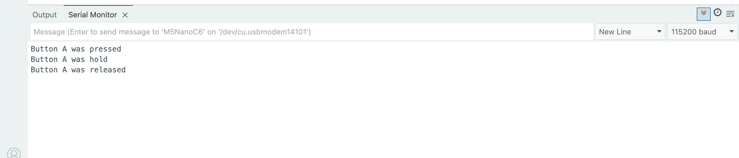 }This program detects the status of the front button on the NanoC6 and prints button events in the serial monitor: