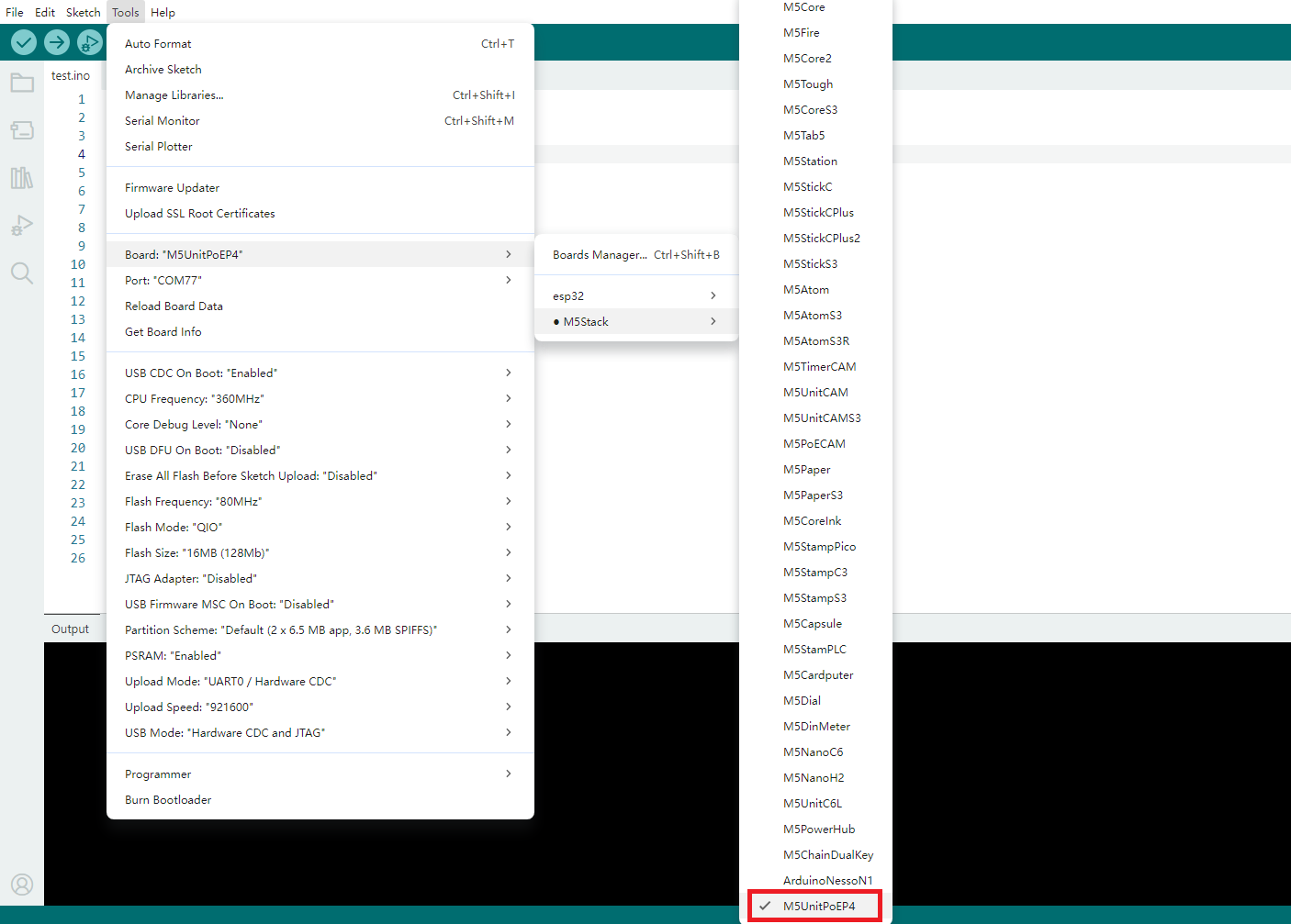 2.Board Manager Installation: Refer to Basic Environment Setup Guide to complete the M5Stack board manager installation and select the development board M5UnitPoEP4.