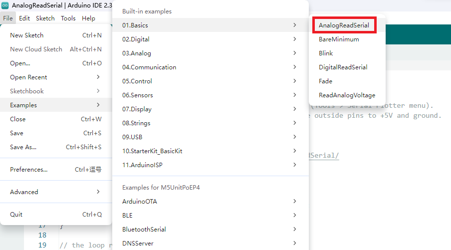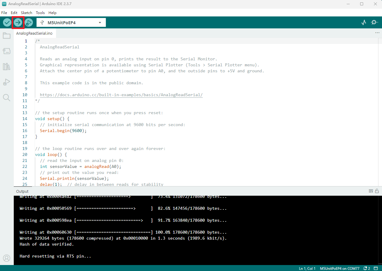 Open the built-in example program Basic -> AnalogReadSerial in Arduino, click the upload button, and the program will be compiled and uploaded to the Unit PoE-P4.