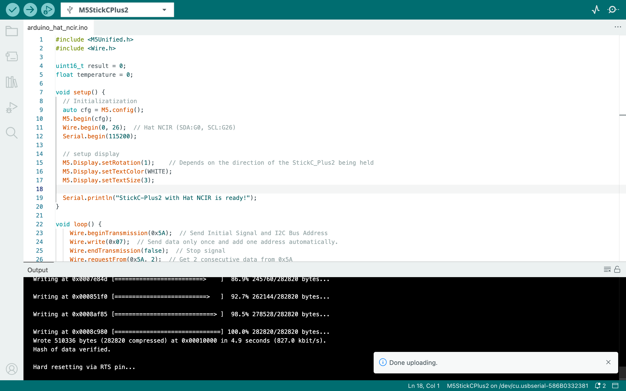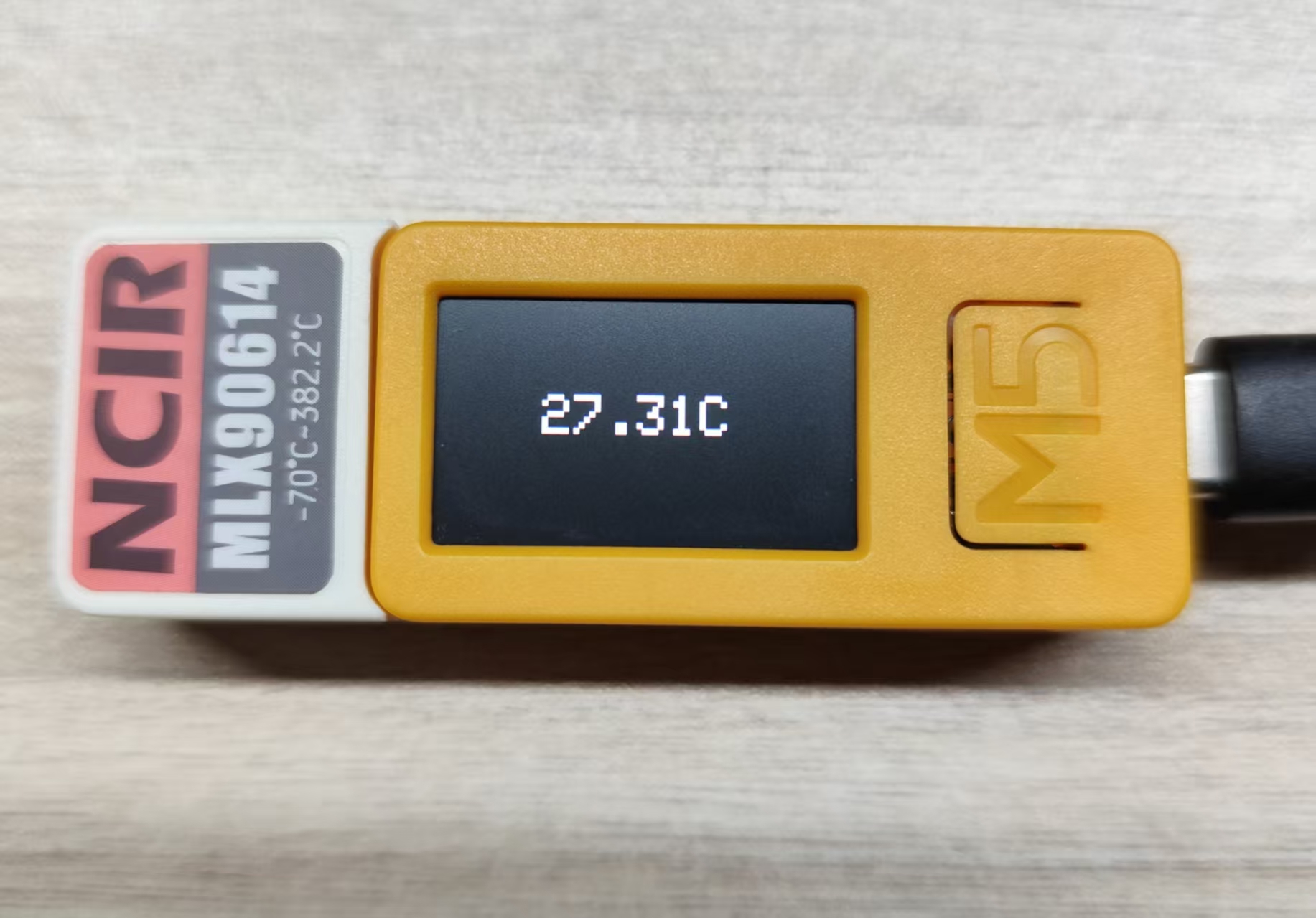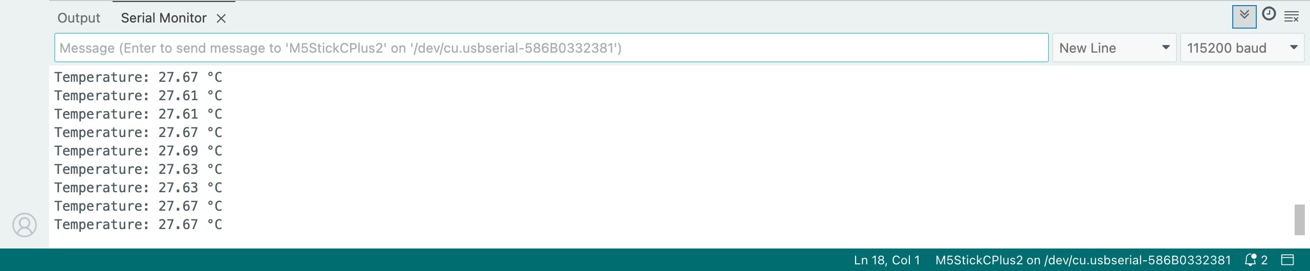 This program detects data from the Hat NCIR single-point infrared temperature sensor and displays it on both the screen of StickC-Plus2 and the serial monitor on the computer: