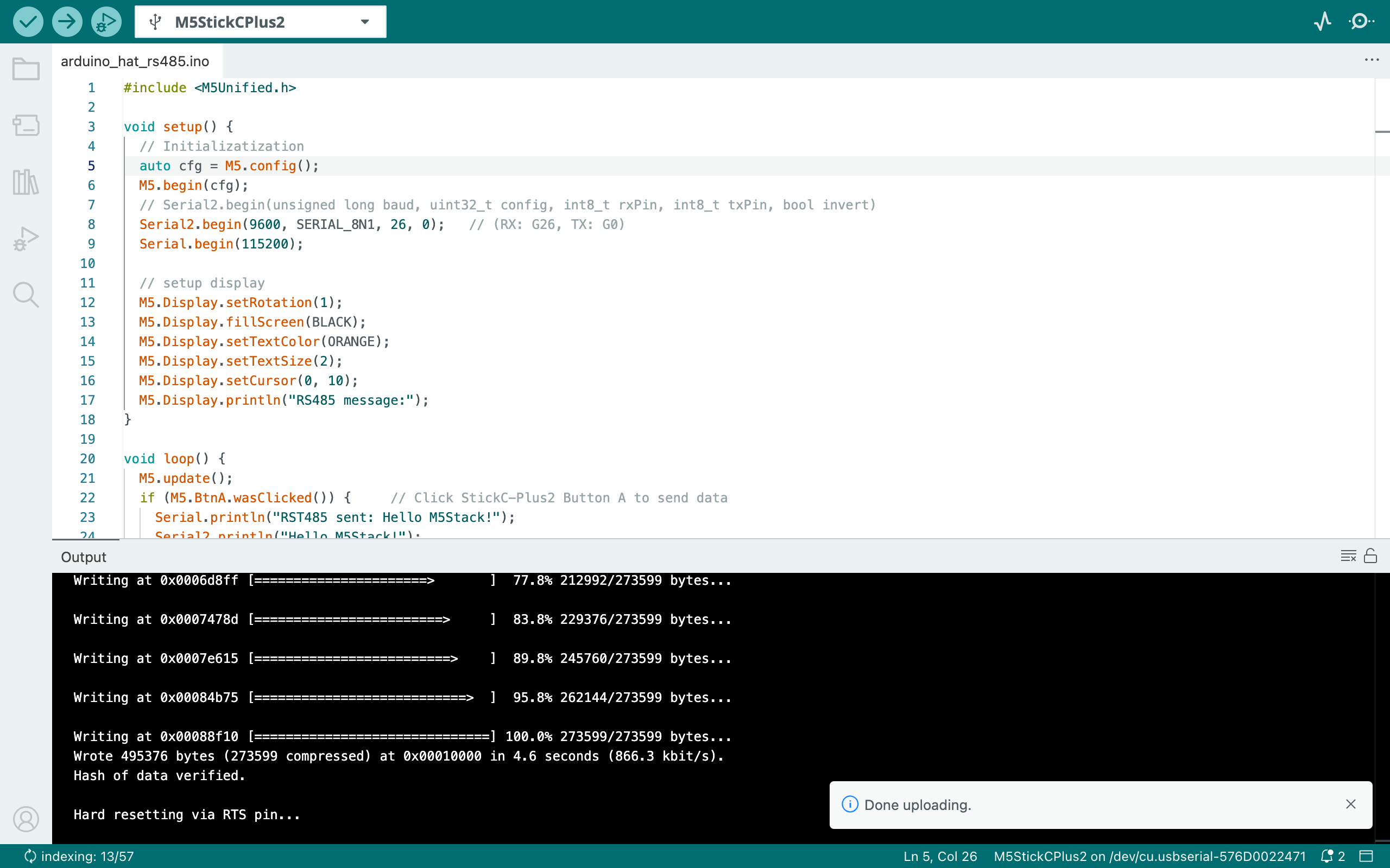 This program will use the TX and RX interfaces of Hat RS485 to send data to each other (press ButtonA on StickC-Plus2 to send data). The transmitted data will be displayed on the screen of StickC-Plus2 and printed on the computer’s serial monitor: