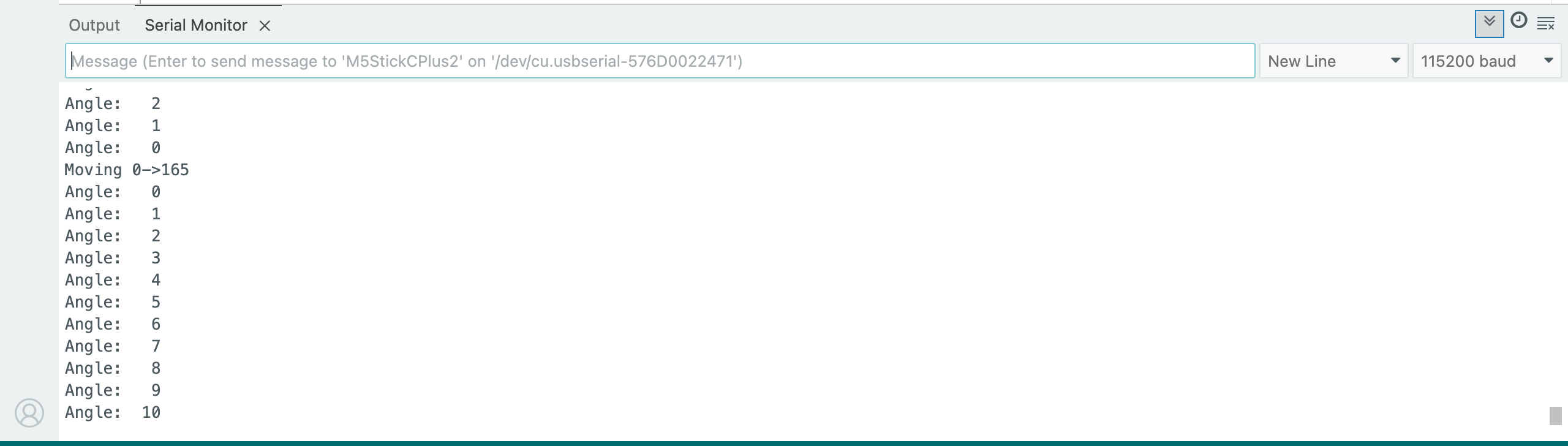 This program will control the rotation angle of the Hat Servo, and print the current angle and status information on the StickC-Plus2 screen and the computer's serial monitor: