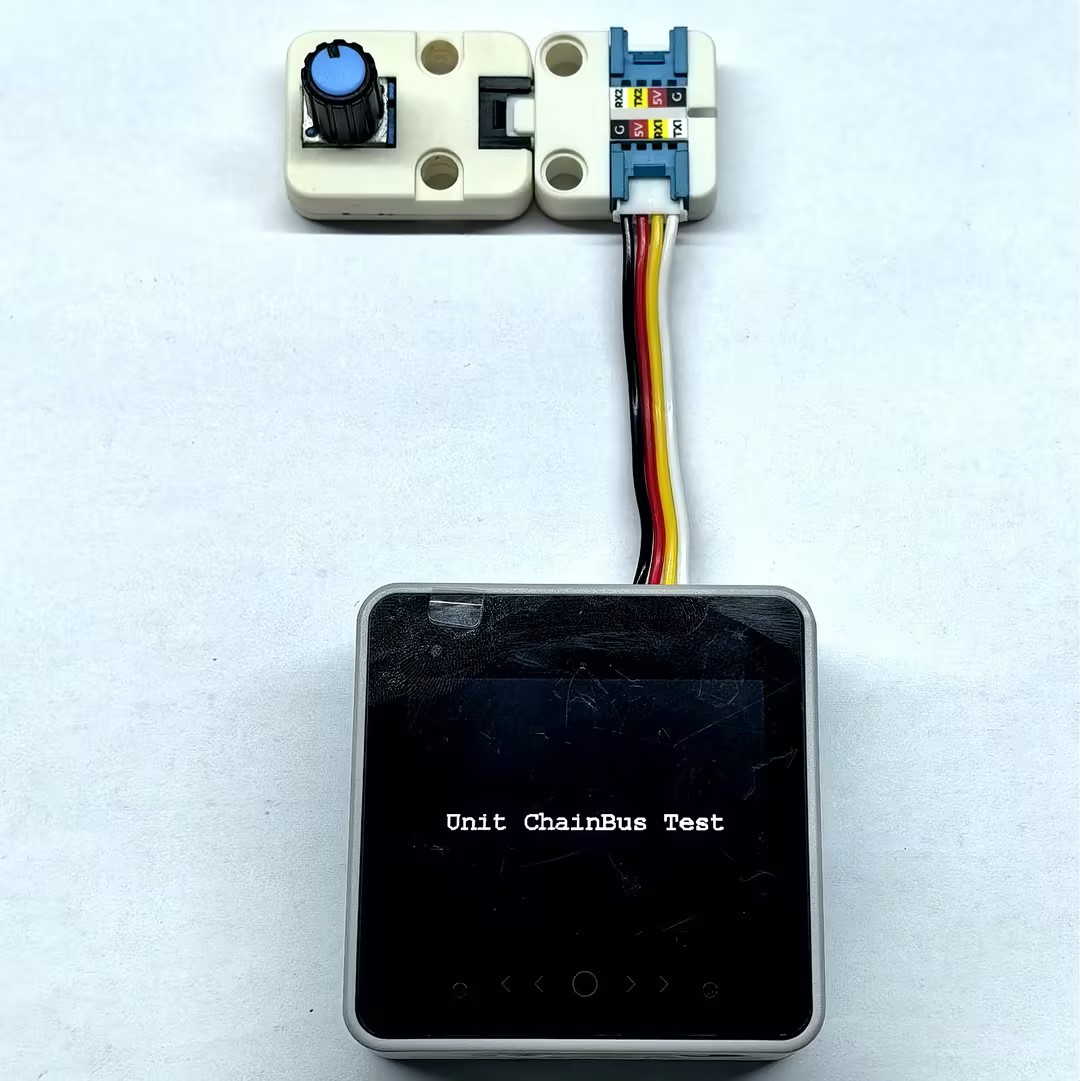 }After power-on, the serial monitor will output information about the connected devices, and read the ADC value from Unit Angle via the Unit ChainBus interface.
