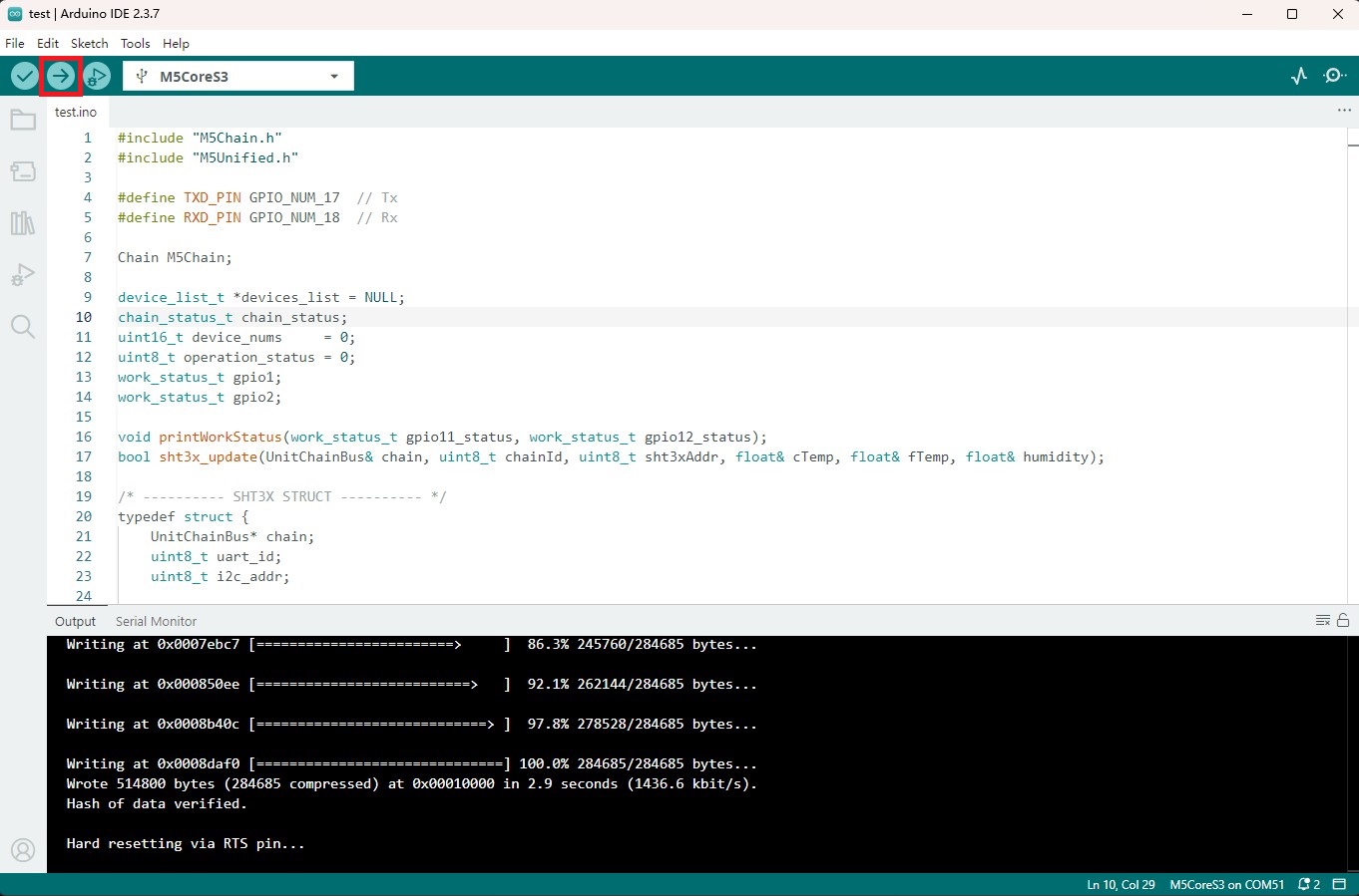 2. Select the device port and click the compile and upload button in the upper left corner of Arduino IDE. Wait for the program to complete compilation and upload to the device.
