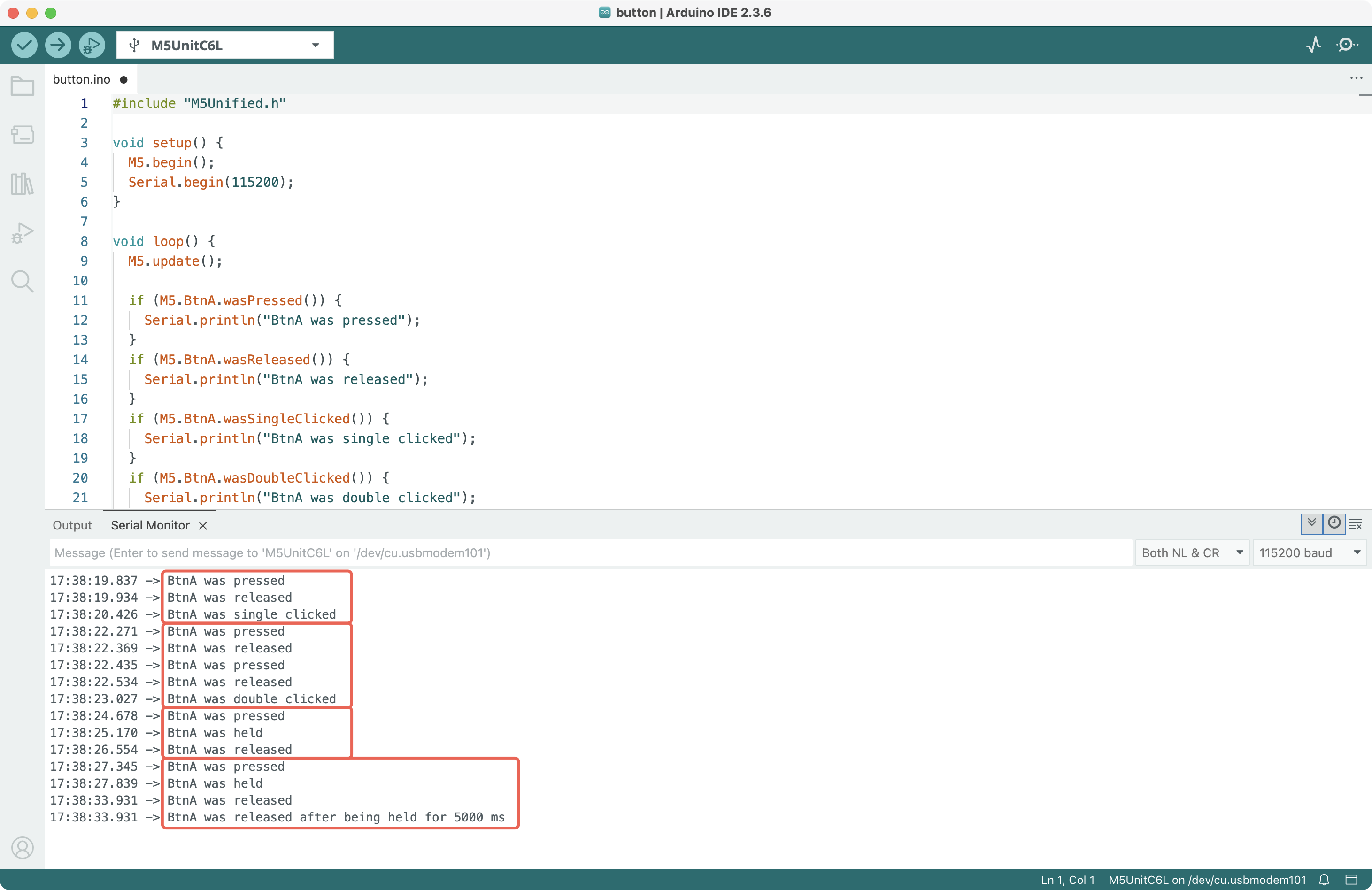 }This program will detect the status of the front button on the device (pressed, released, single short press, double short press, long press, released after a long press of 5000 ms), and print messages in the Serial Monitor: