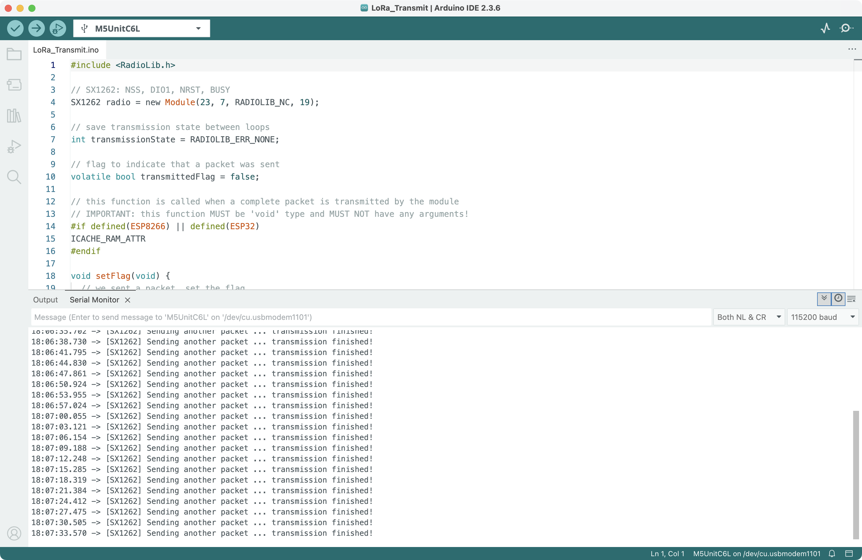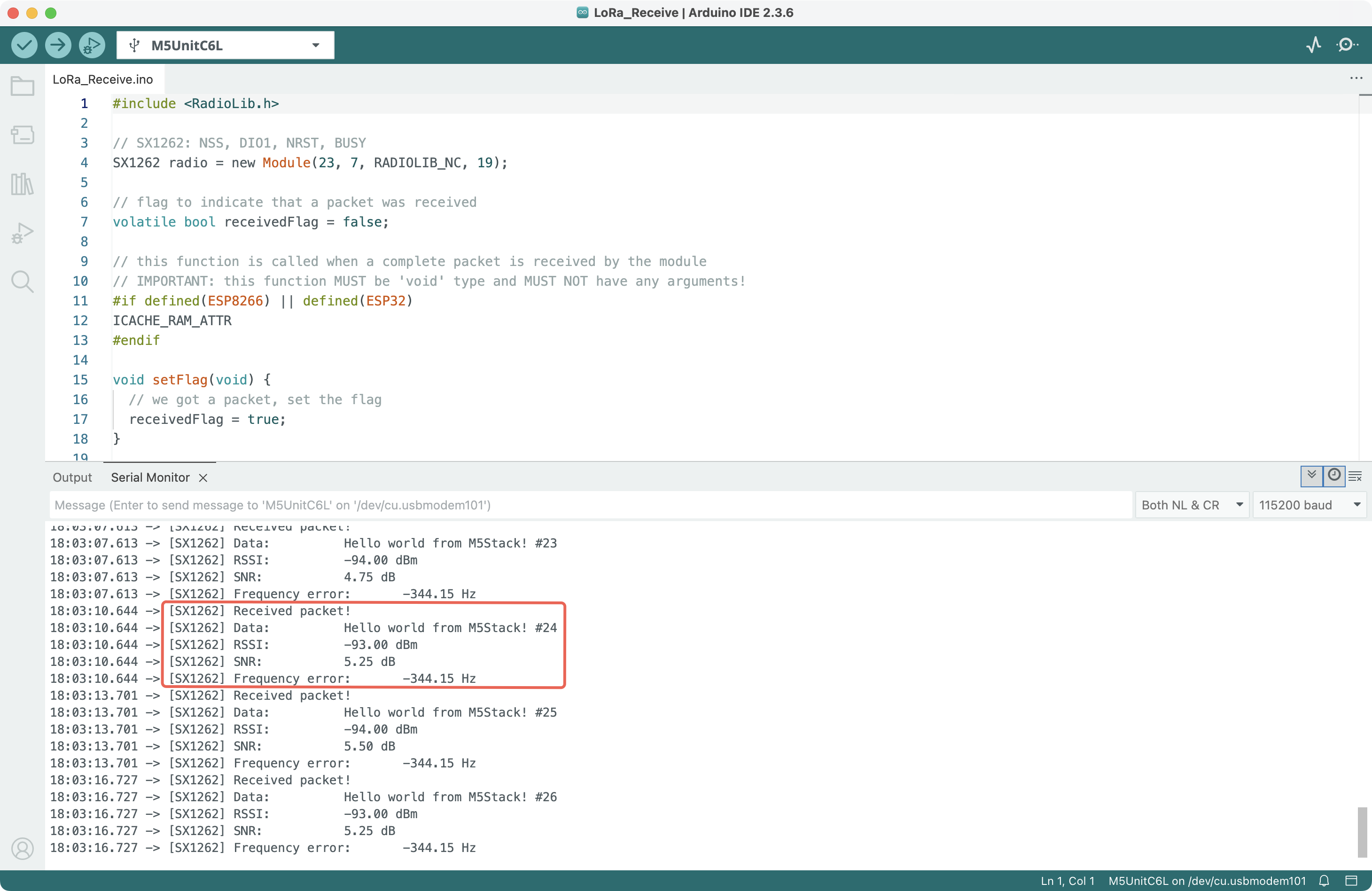 Compile and upload the two sketches to two Unit C6L respectively. The transmitter will send LoRa signal, and the receiver will capture this signal. Their serial output is shown below: