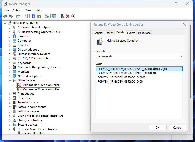 After booting, press Win+R, type devmgmt.msc, to open Device Manager. An unknown multimedia video controller should appear under Other Devices. The VENDOR property should be 1F4B.