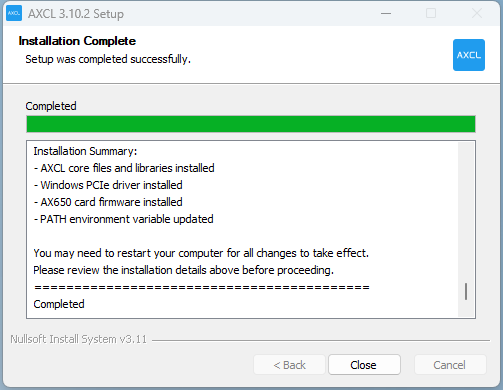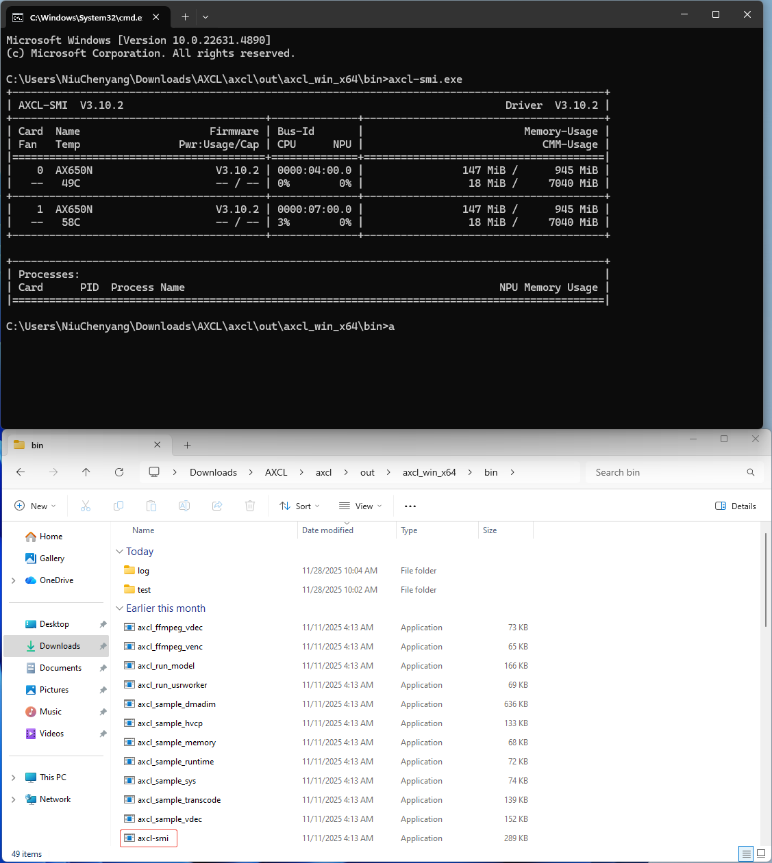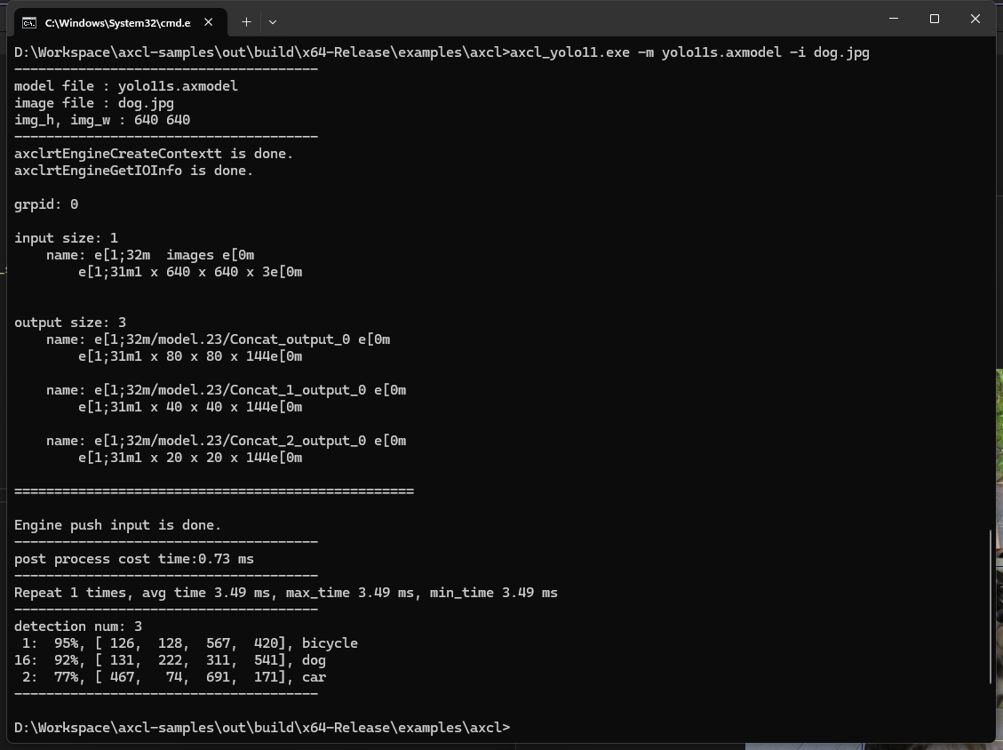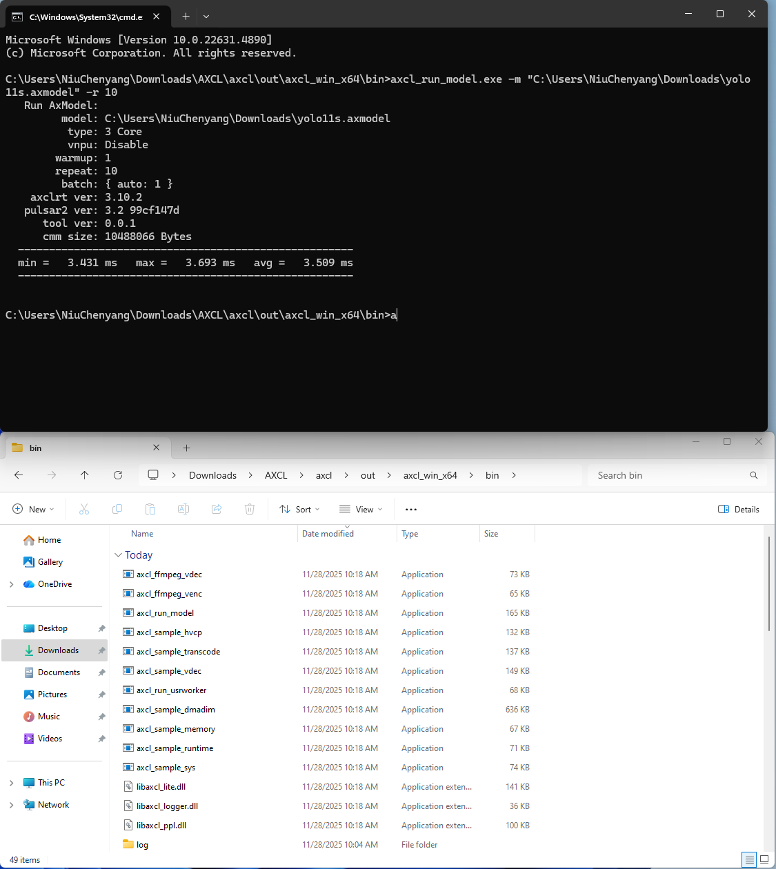 Navigate to the output directory and run axcl_run_model.exe -m yolo11s.axmodel -r 10. Remember to replace with your own model path. Precompiled programs and model download