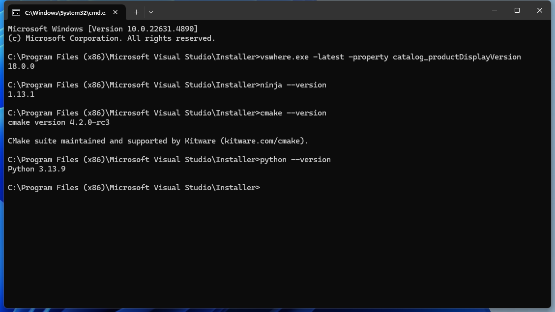 ninja, recommended v1.31.1. Add ninja.exe path to system environment variable Path.