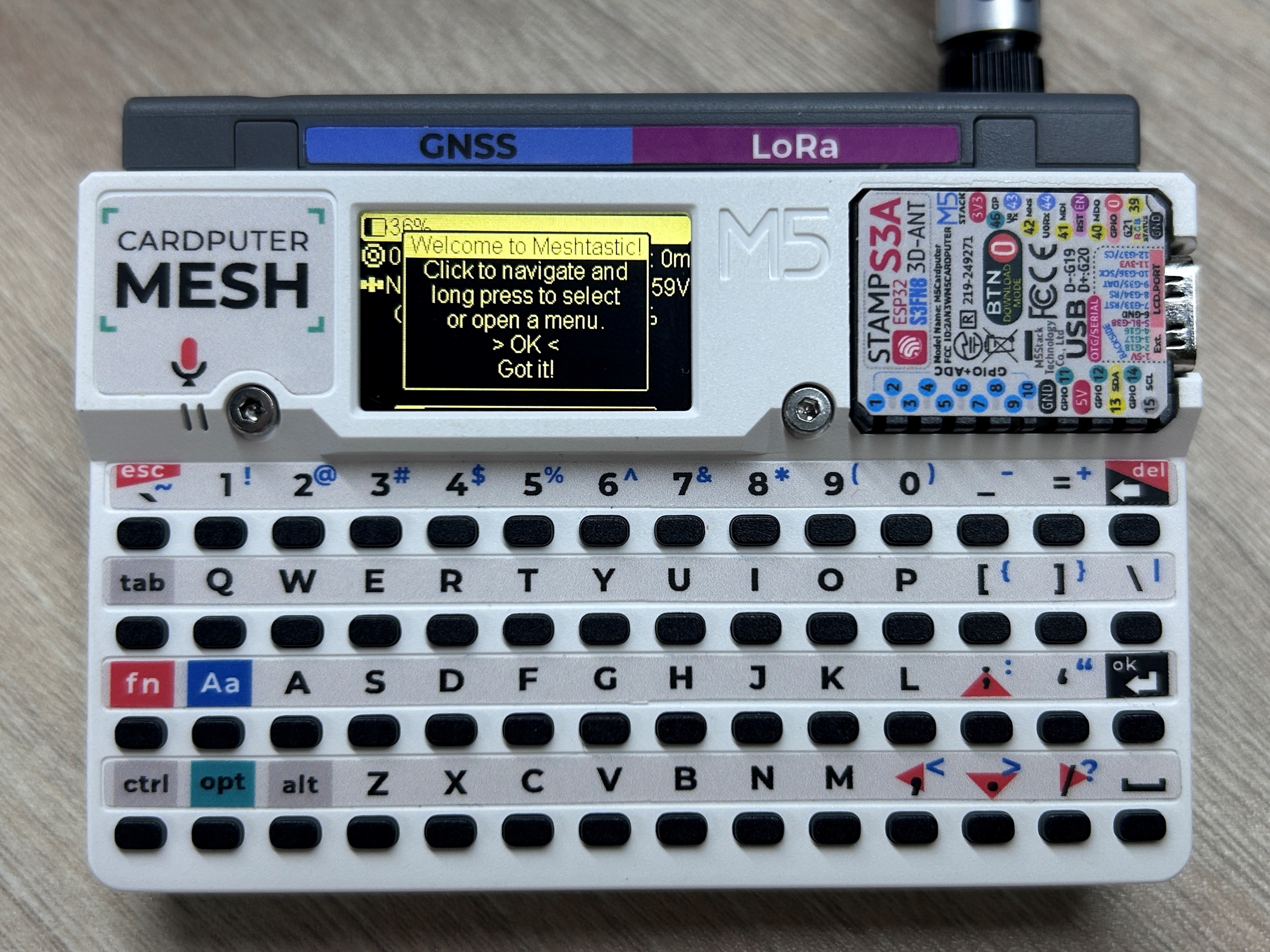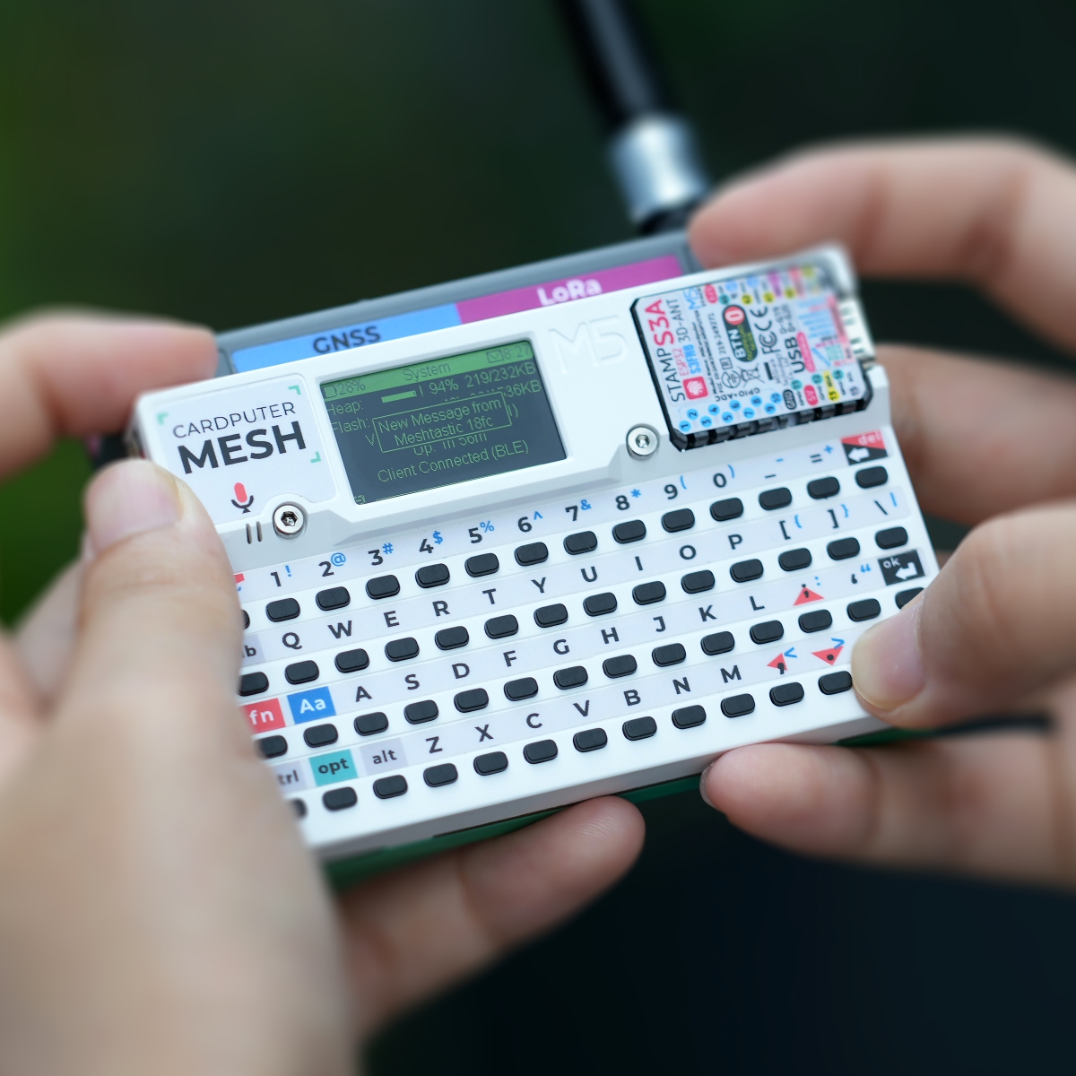The Cardputer-Adv is equipped with a full keyboard that supports text input. The onboard firmware also provides basic functionality such as sending and receiving messages.