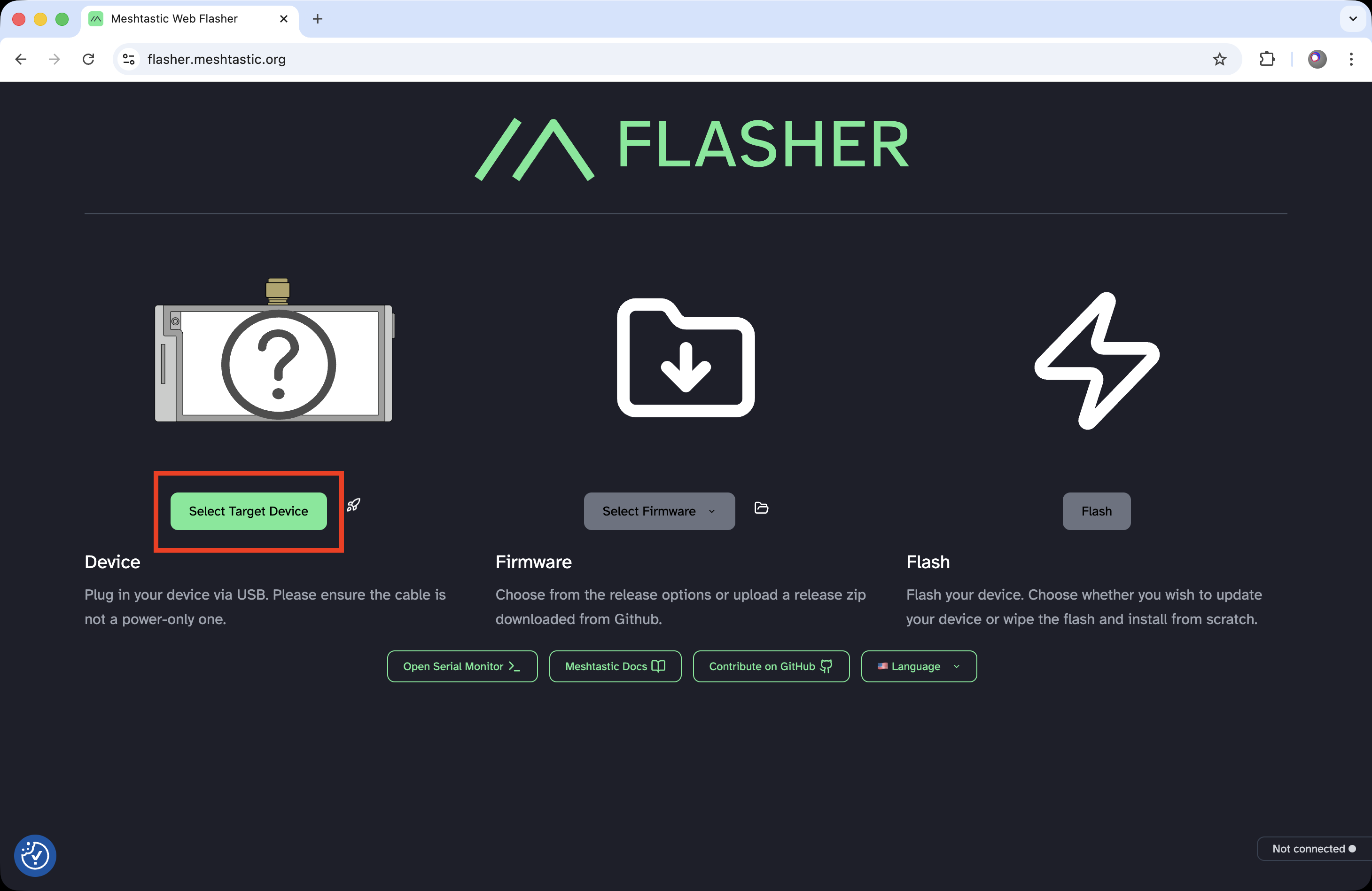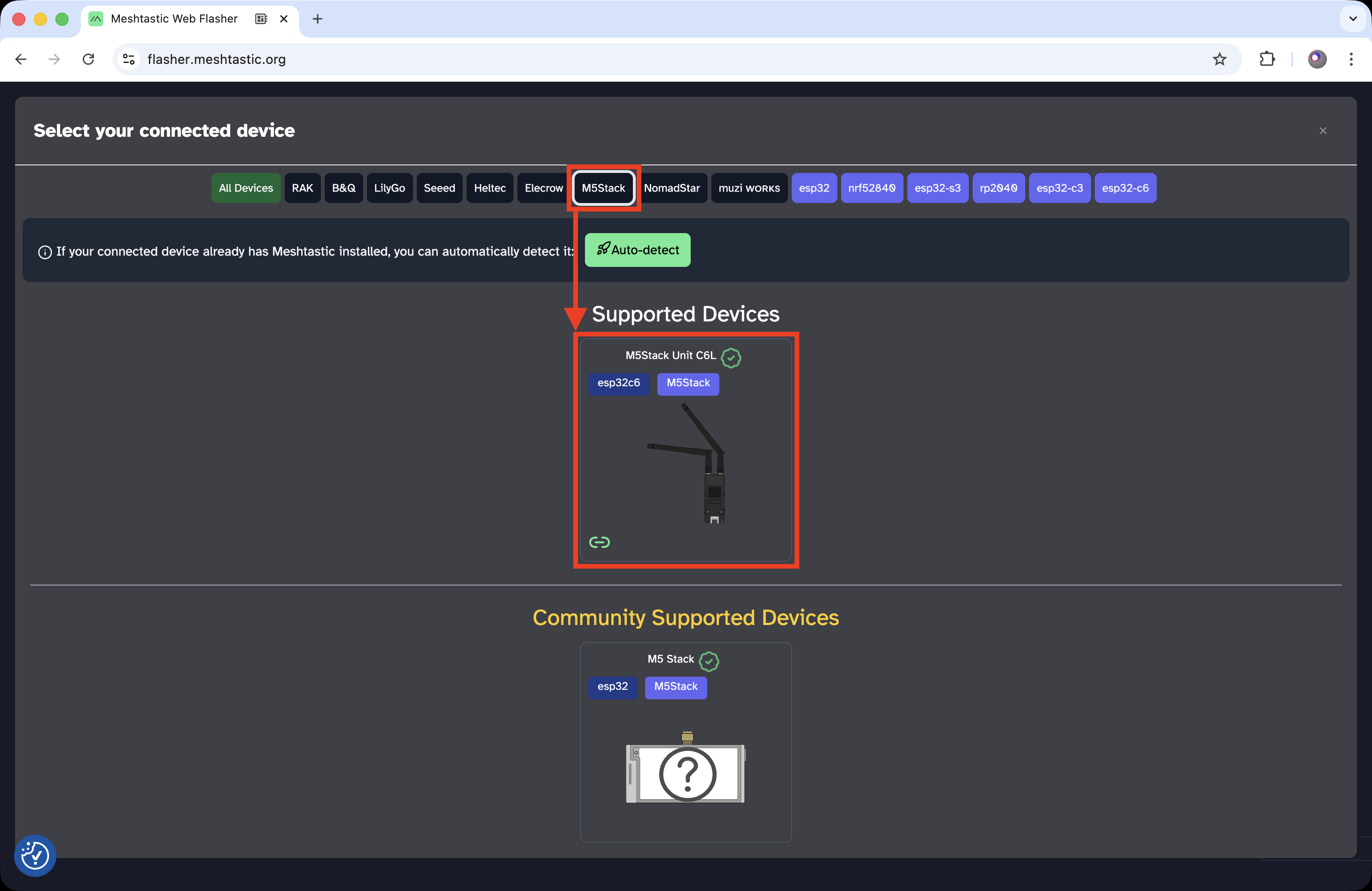 After connecting the Unit C6L to your computer using a USB-C data cable, press and hold the switch on the left side of the device to enter download mode. Open the Meshtastic official web flasher in the Chrome browser, click Select Target Device on the left side, then click M5Stack at the top and select M5Stack Unit C6L.