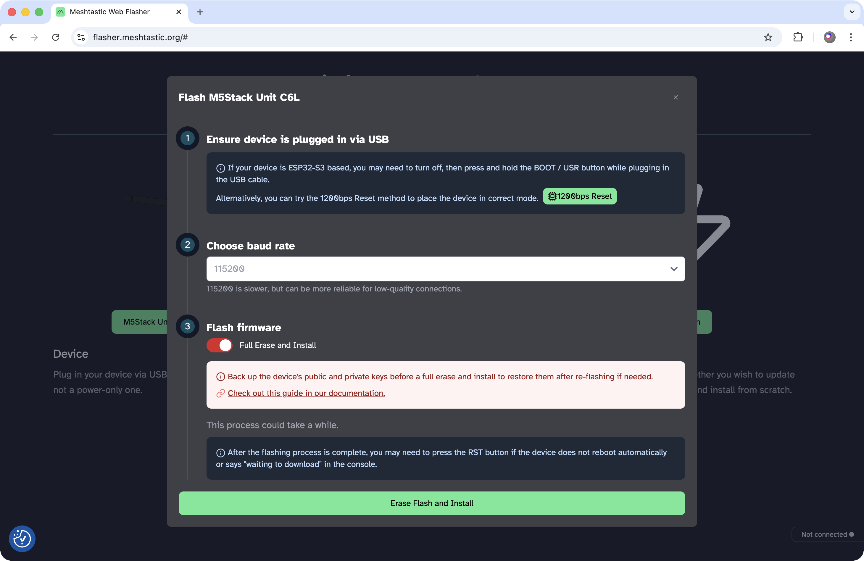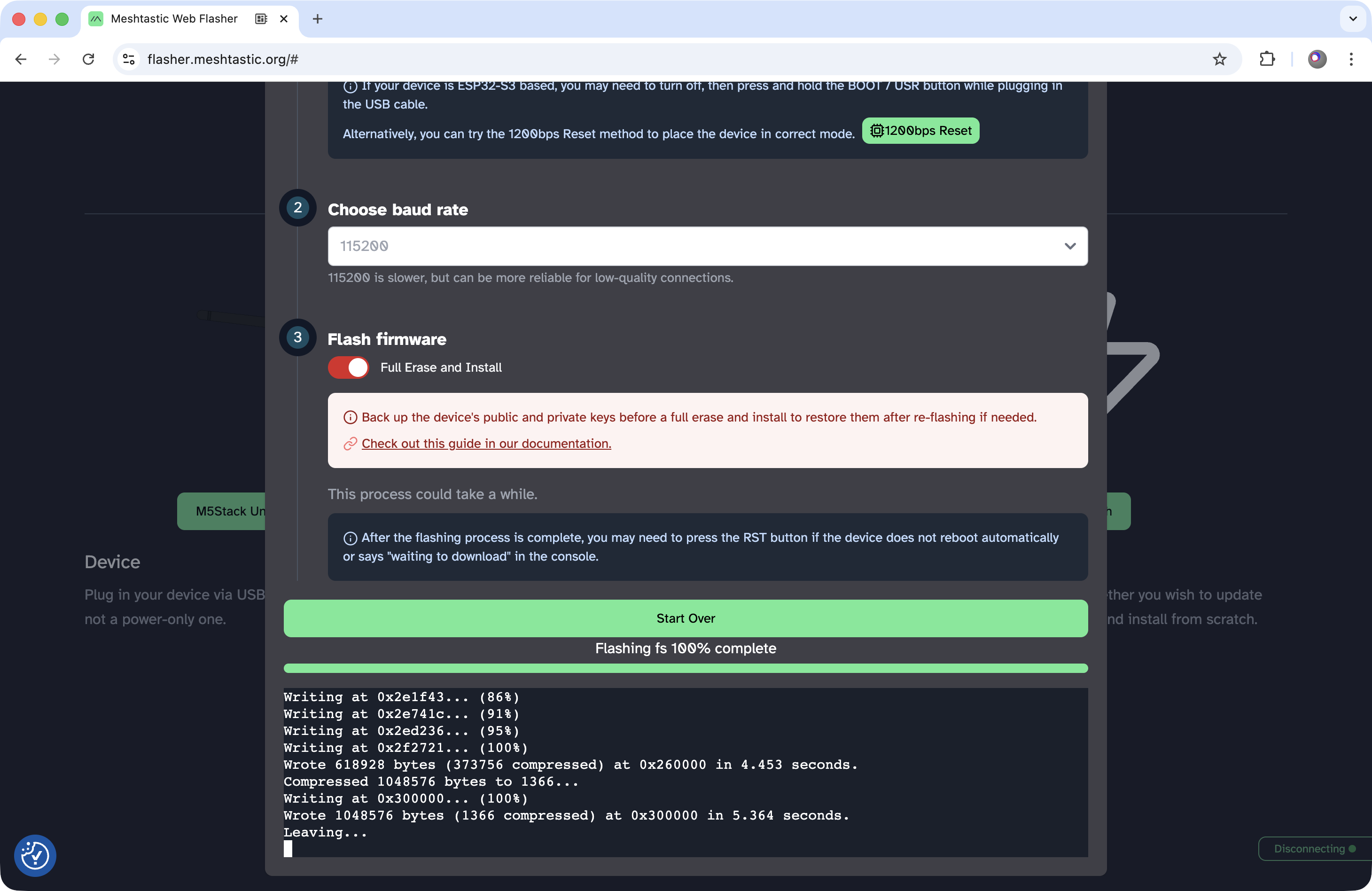 In the popup window, scroll to the bottom and click Continue. Select the baud rate of 115200, enable Full Erase and Install, and click Erase Flash and Install. In Chrome’s popup menu, select the correct USB port to start flashing. Wait until the button text changes to Start Over. The firmware installation is now complete, and you can close the webpage.
