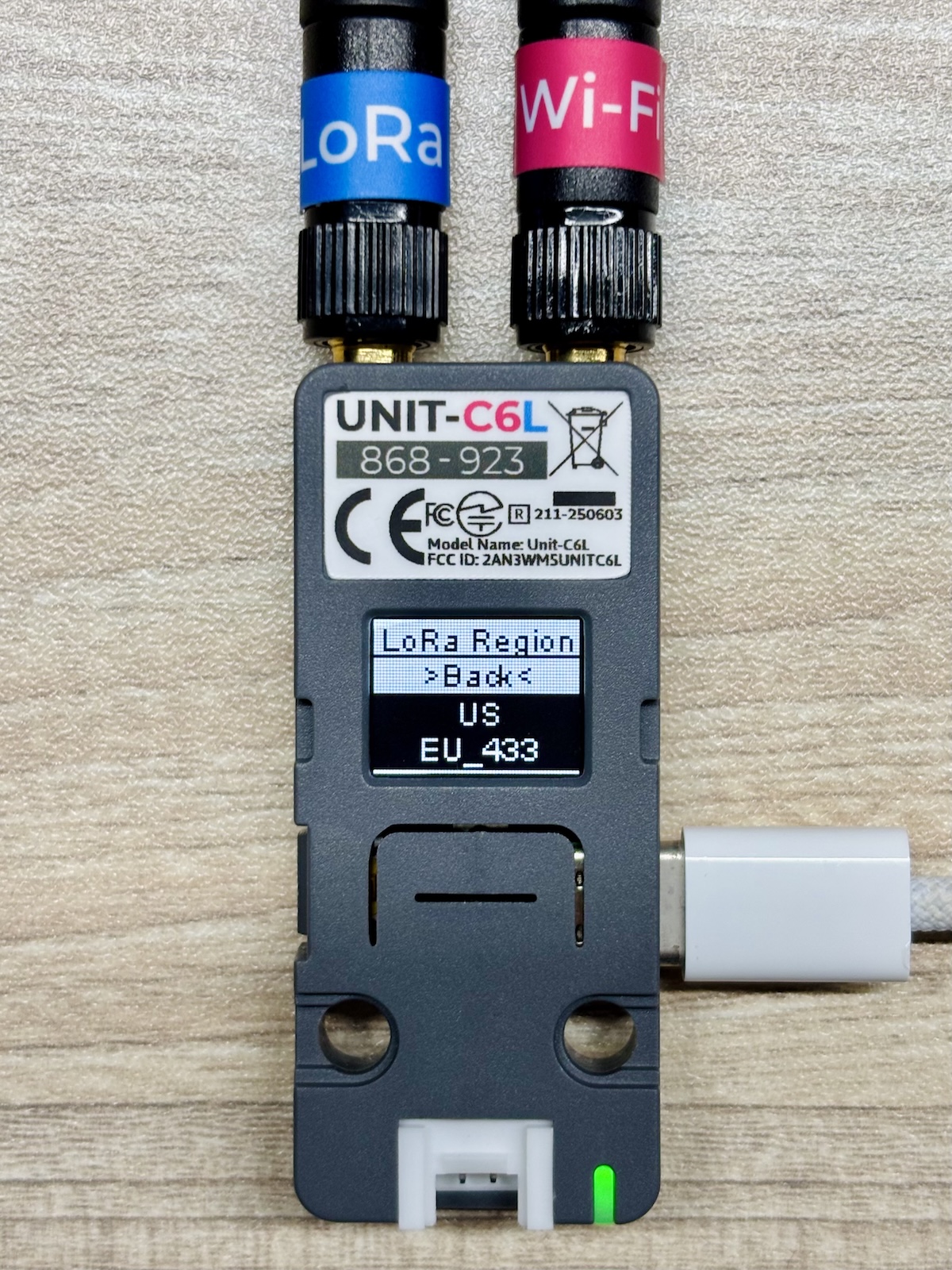 Disconnect and reconnect the USB-C cable. After the device starts, a LoRa Region selection screen will appear. You need to set the region according to the hardware type (in this example, US). Press the front button briefly to scroll through options, and press and hold the button to confirm your selection.
