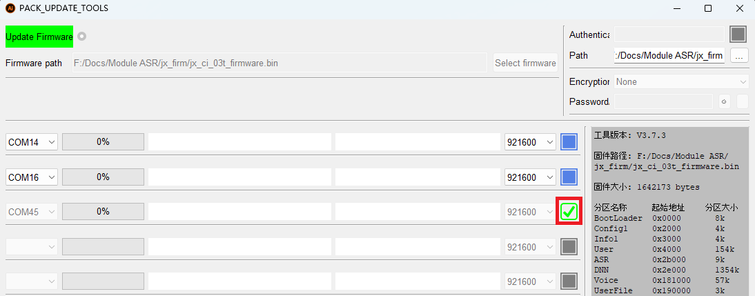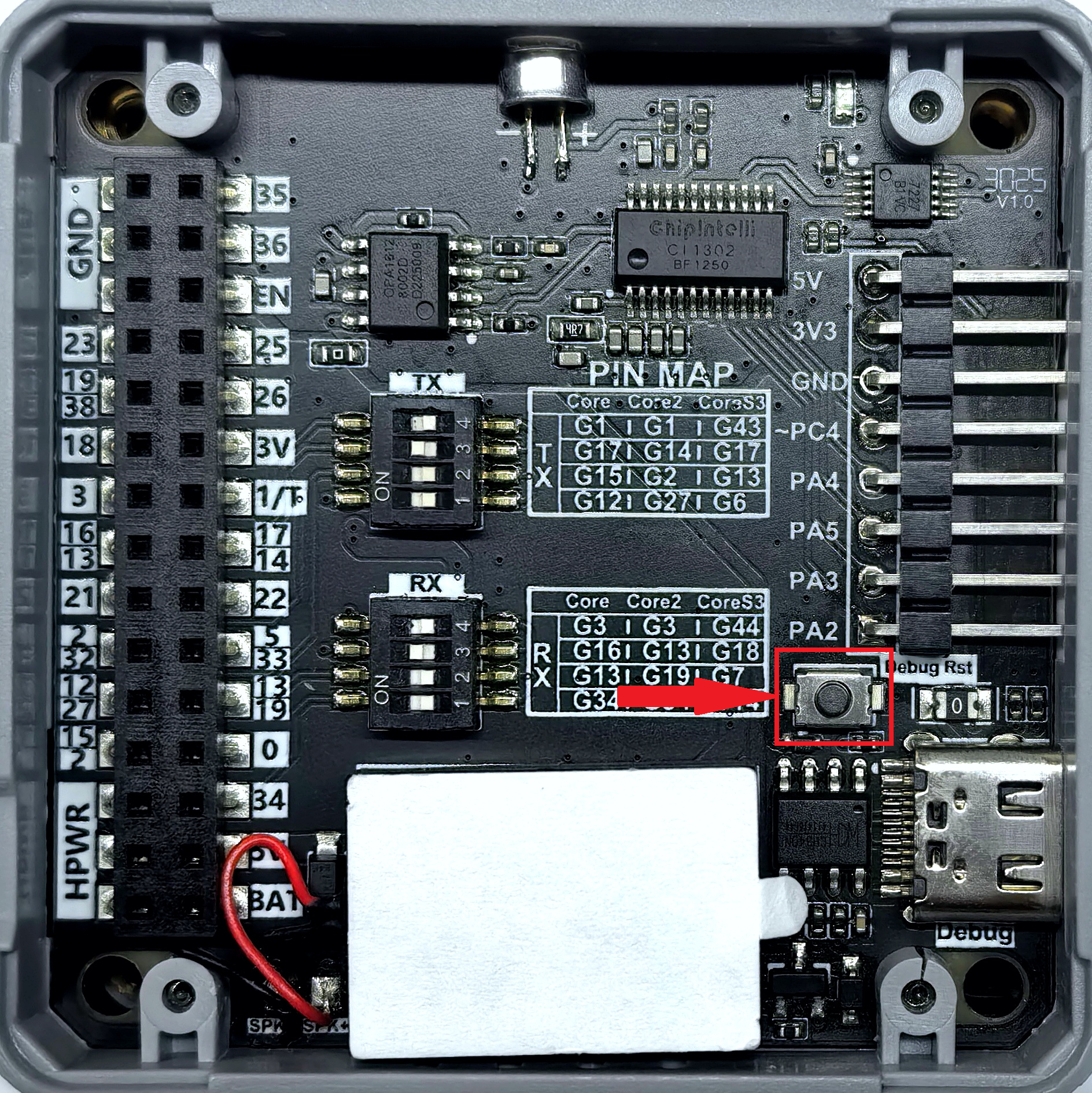 Once the flashing tool detects the correct COM port, check the port to activate download mode, then press the Debug Rst button to start downloading the program.