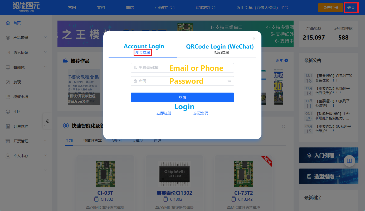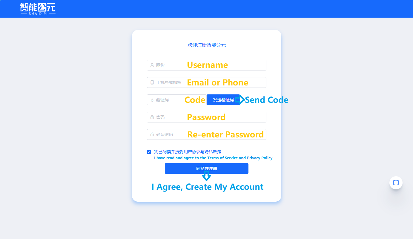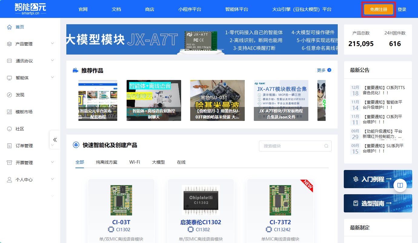 产品管理 (Product Management) page and click the 所有产品 (All Products) item.免费注册 in the upper-right corner to open the registration page. Enter your phone number/email address, then click 发送验证码 (Send Code) to receive the verification code. Fill in the remaining required information and click 同意并注册 to complete the registration.