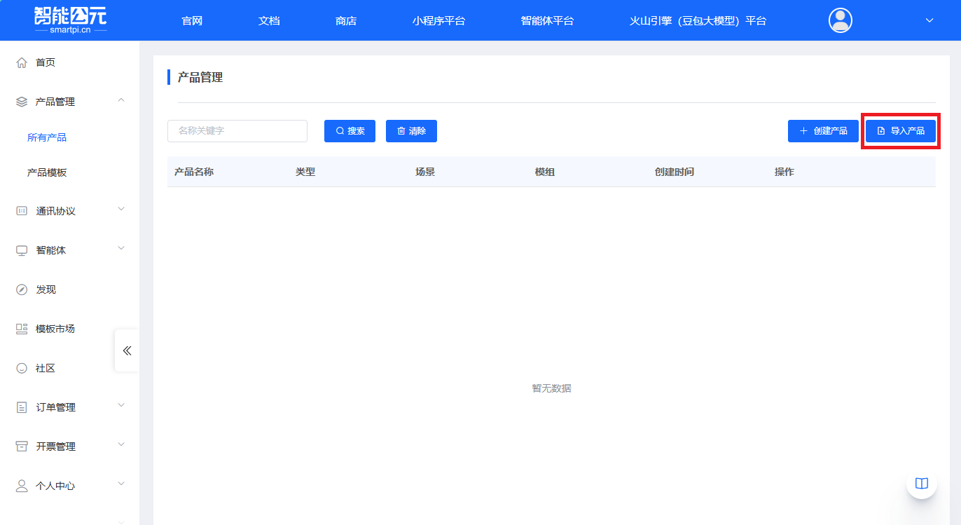configuration template for each language or regenerate via the platform.导入产品 (Import Product) and import the product configuration template (.json) downloaded in the previous step. This tutorial uses the English template as an example.