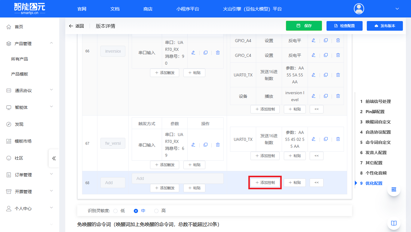 >>) and then click + Add Control to configure detailed parameters for the current command.no-wake-word triggers (e.g. "Hi M Five", "Hi ASR") for wake interactions. This option conflicts with the custom wake word section; if both are enabled, only the custom wake word will be triggered. To avoid conflicts, simply select commands from the command list as no-wake-word triggers and do not set a separate custom wake word.