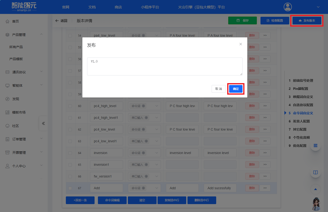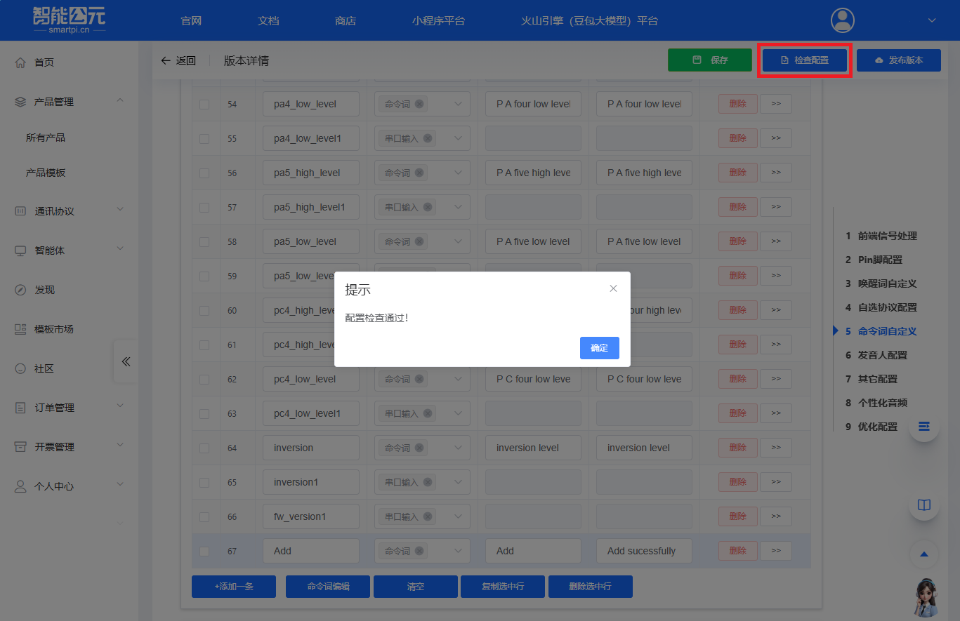 Add. Next, click the Configuration Check option in the menu to validate for errors. If everything is correct, click Publish Version to package the firmware.