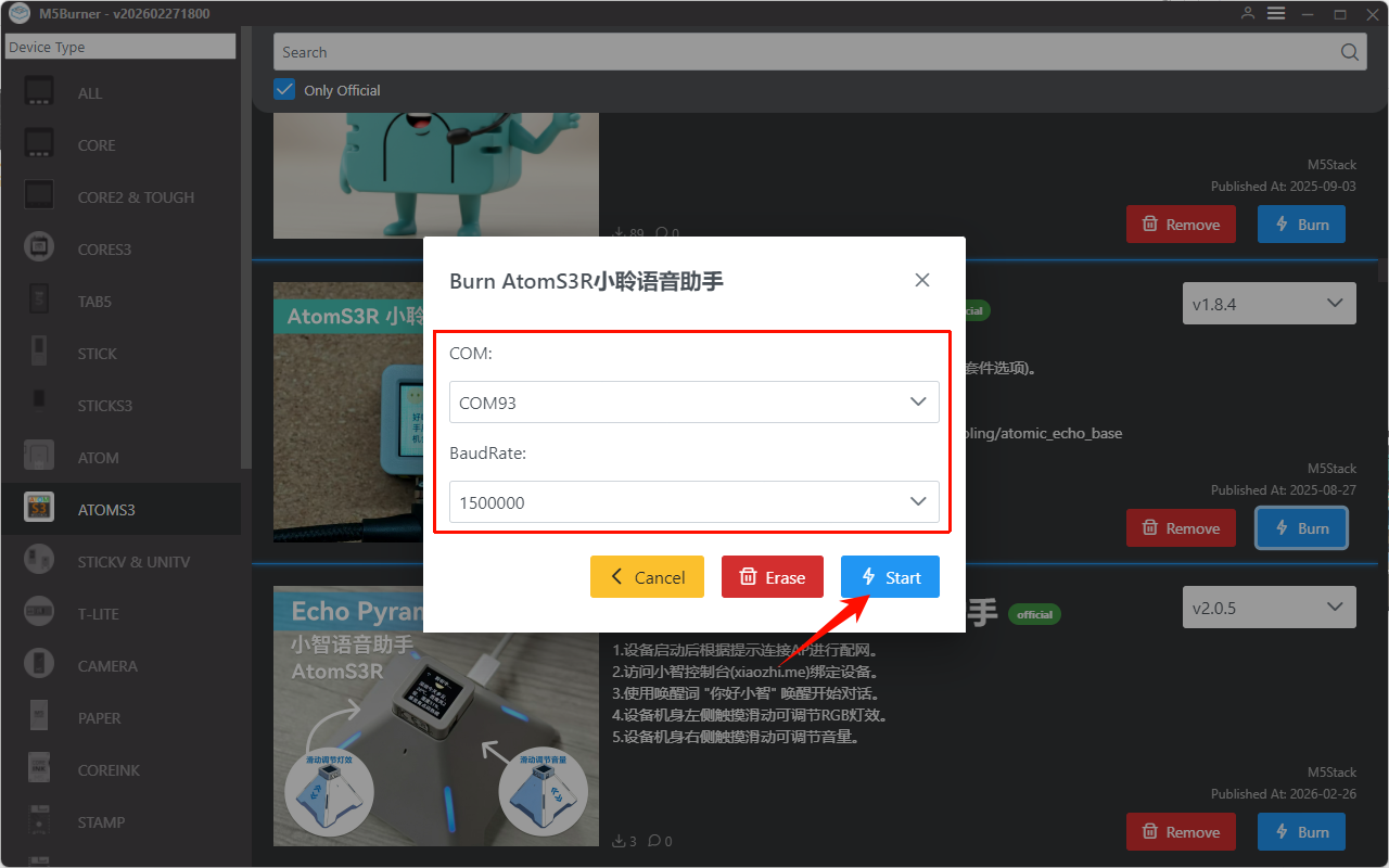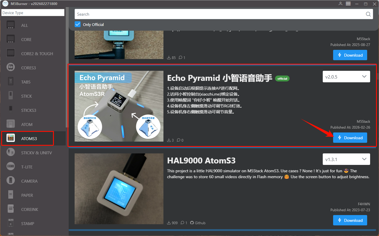 ATOMS3, and click Download to download the Echo Pyramid Xiaozhi Voice Assistant firmware.