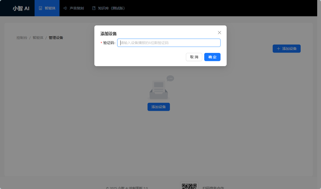 Obtain the device verification code. Once the Wi-Fi configuration is successful, the device will automatically broadcast "Please log in to the control panel to add the device and enter the verification code xxx." Devices with a screen will also display the verification code on the screen.