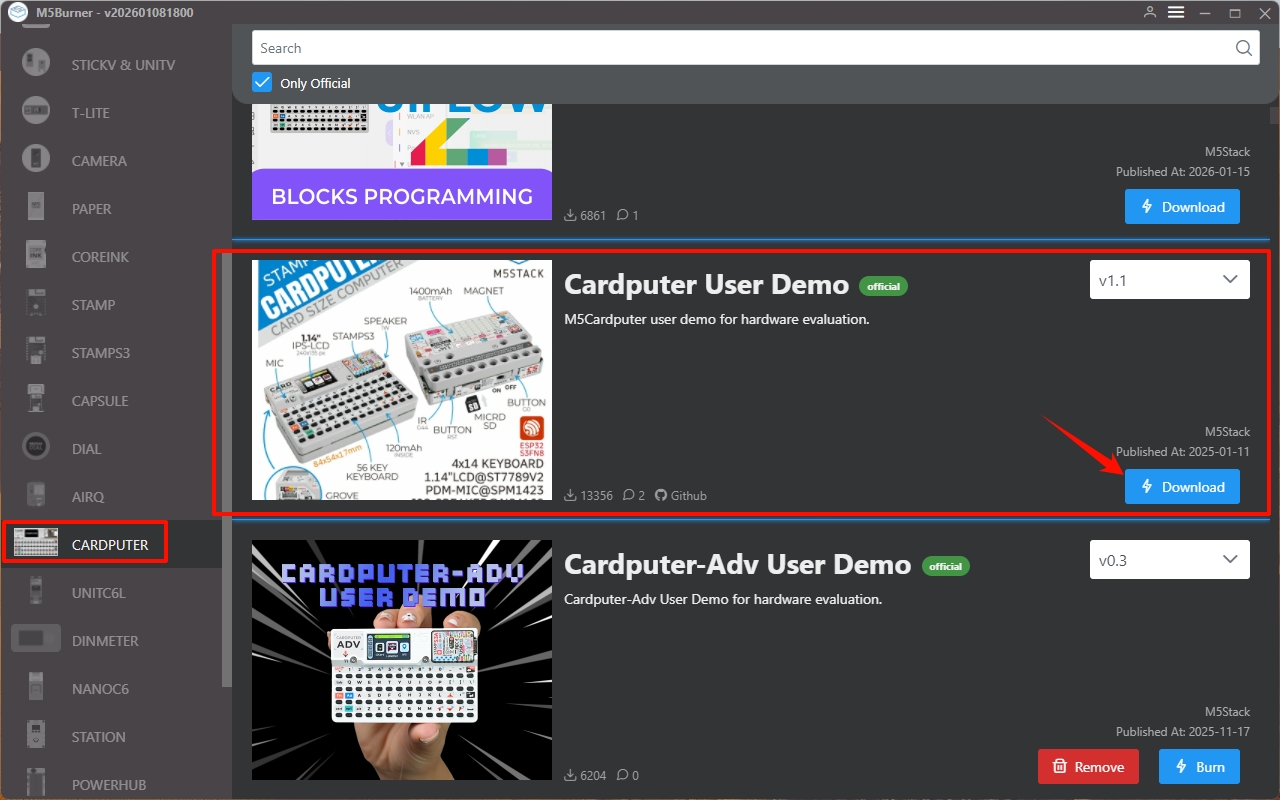 To enter Download Mode, set the power switch on the side of the Cardputer to the OFF position. Then, before powering on, press and hold the G0 button. After the device is powered on from the rear, release the button. The device will then enter Download Mode.