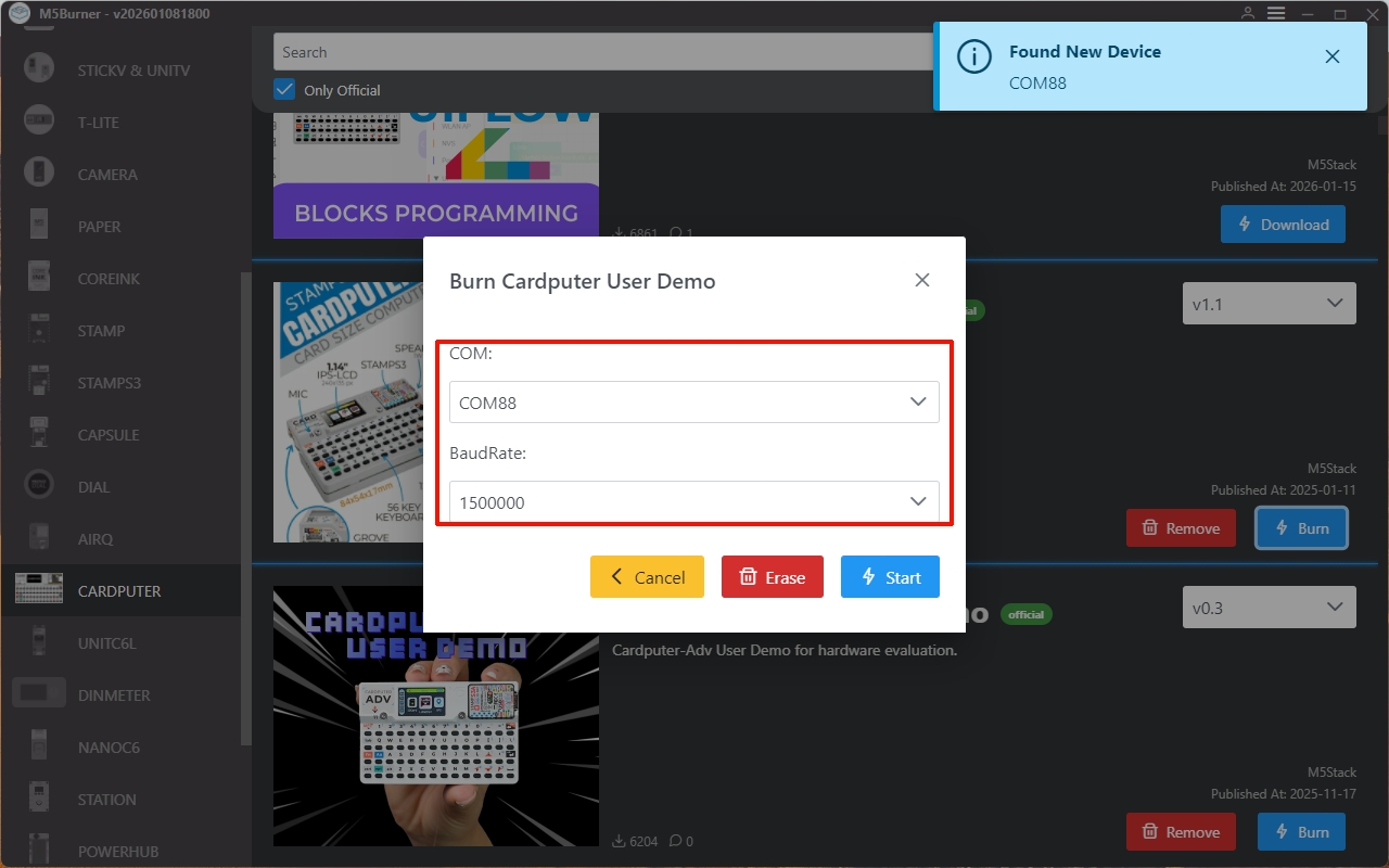 Connect the device to the computer via a USB cable. After the device enters Download Mode, select the corresponding device port in M5Burner.