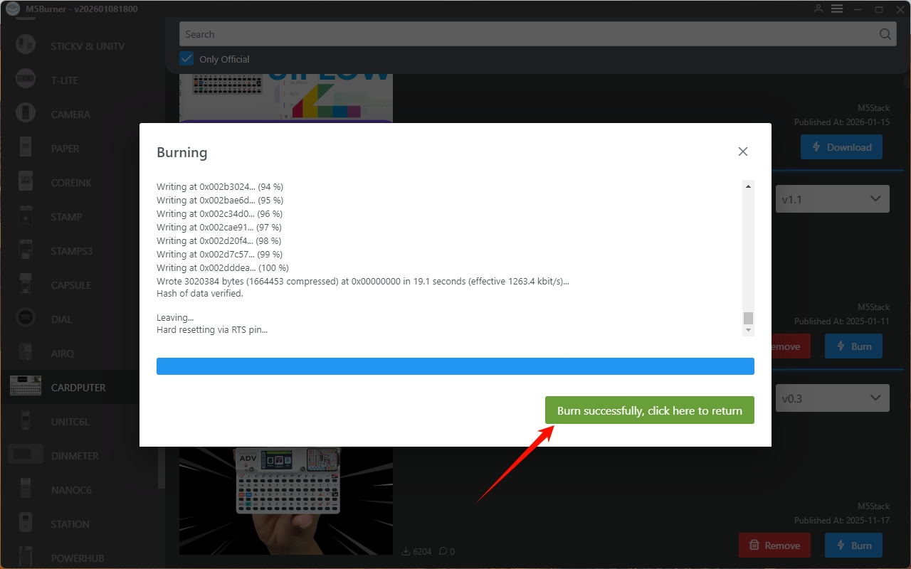 Click Start to begin flashing. After the flashing is complete, the interface will display Burn successfully, click here to return.