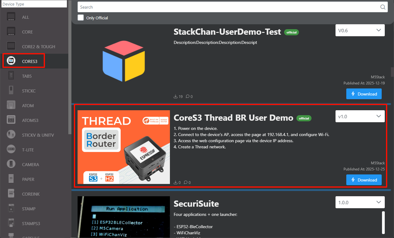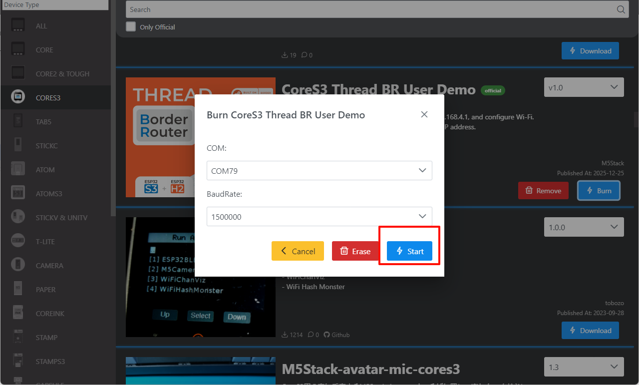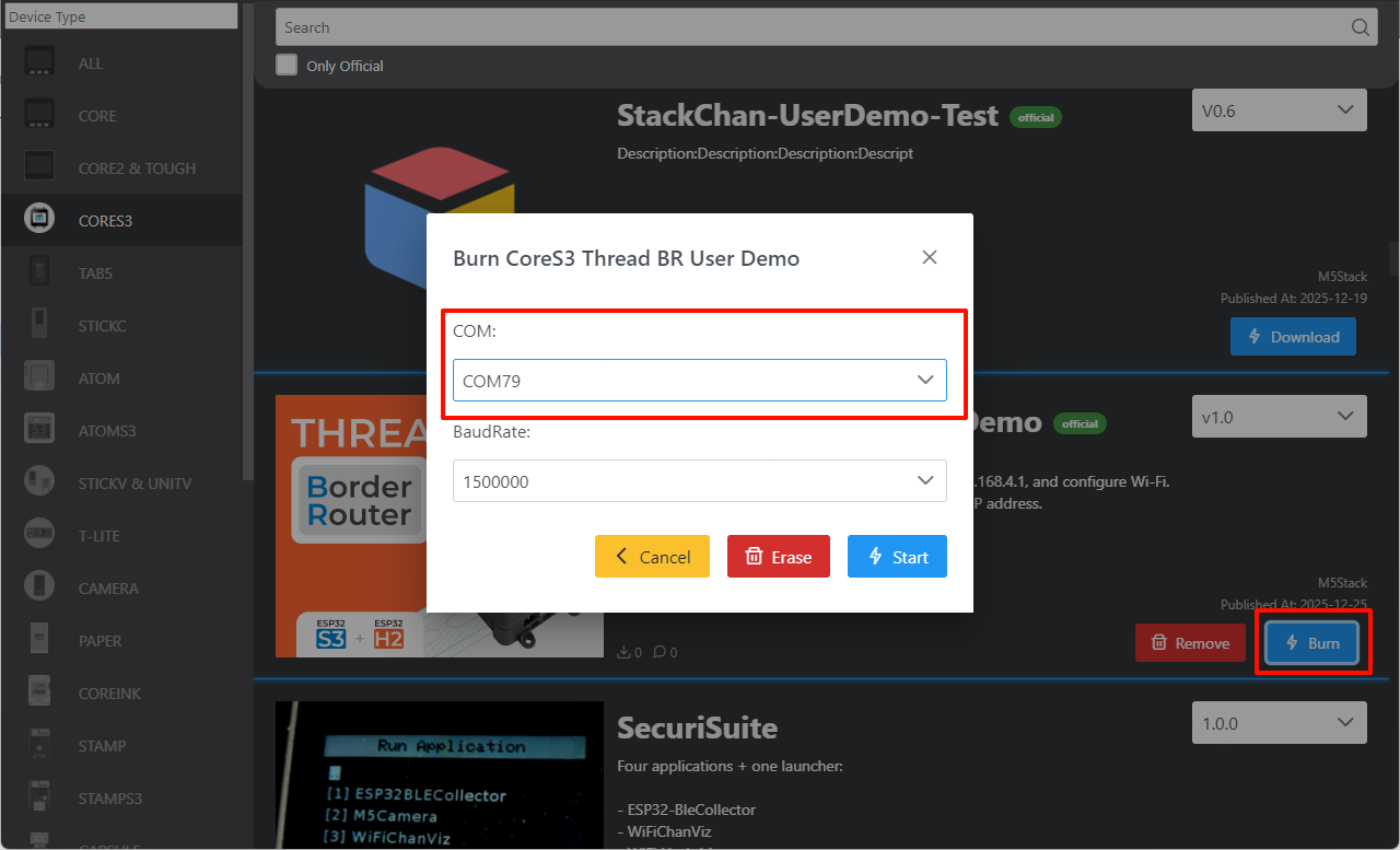 Connect the device to the computer via a USB cable. After the device enters download mode, select the corresponding device port in M5Burner.