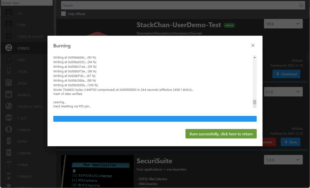 When the device works abnormally, you can try reflashing the factory firmware to check whether there is a hardware fault. Refer to the following tutorial. Use the M5Burner firmware flashing tool to flash the factory firmware to the device.