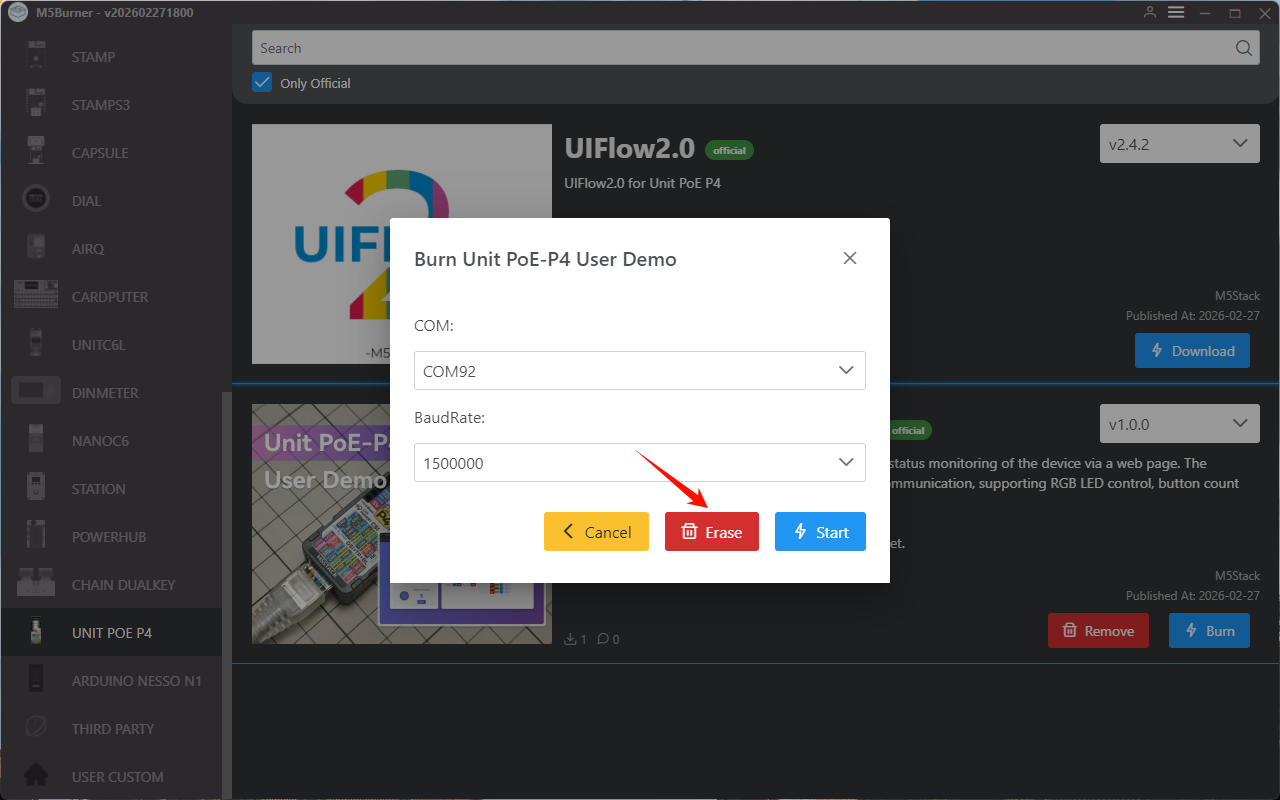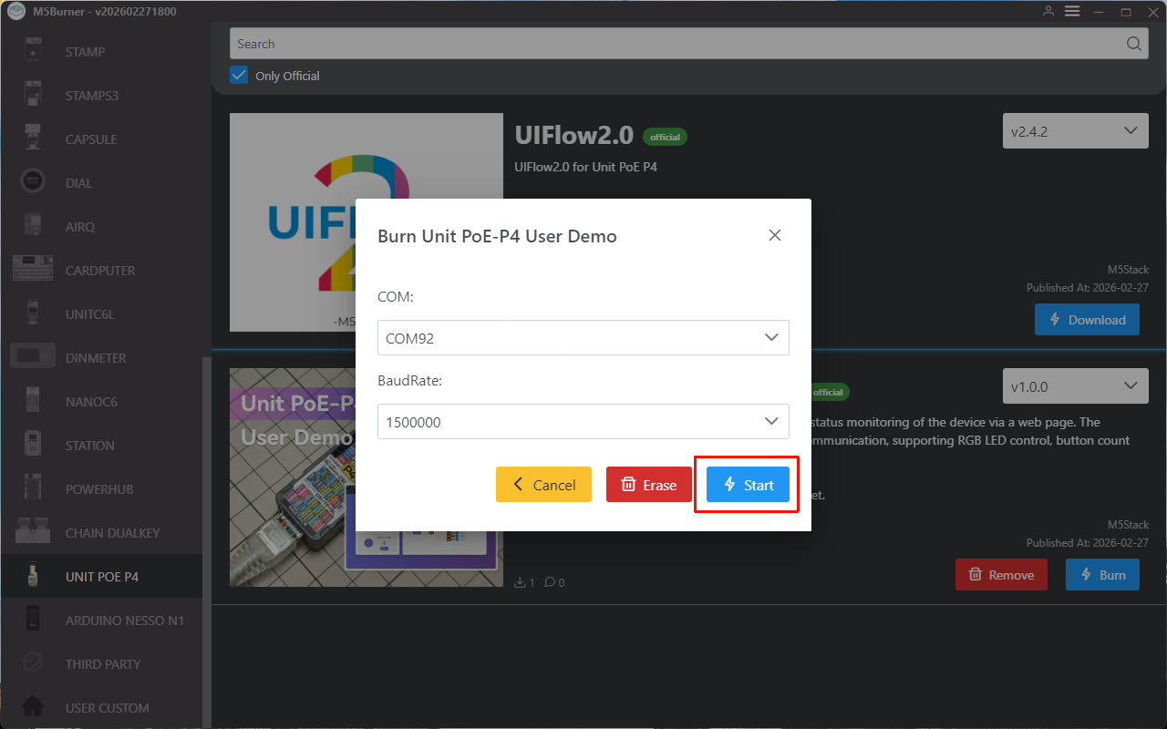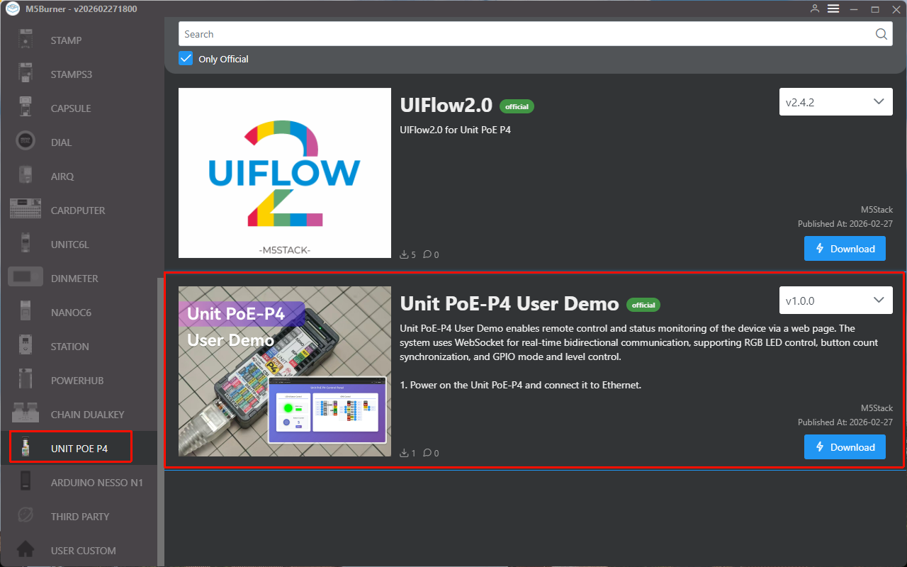 - Refer to the M5Burner tutorial to complete the download of the flashing tool, and refer to the image below to download the corresponding firmware.