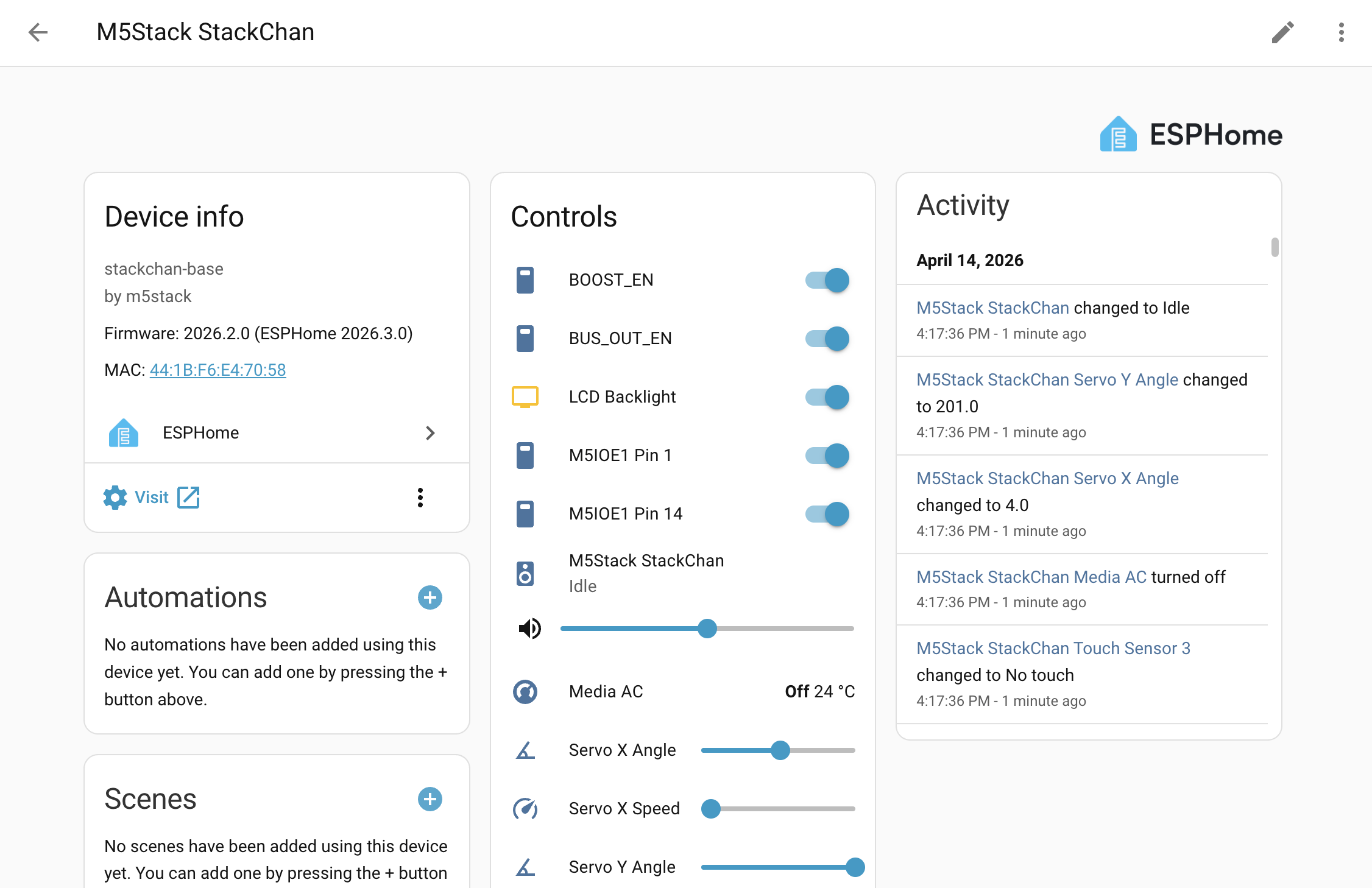 This component requires I2C and can provide touch results when touching StackChan's head using text_sensor.