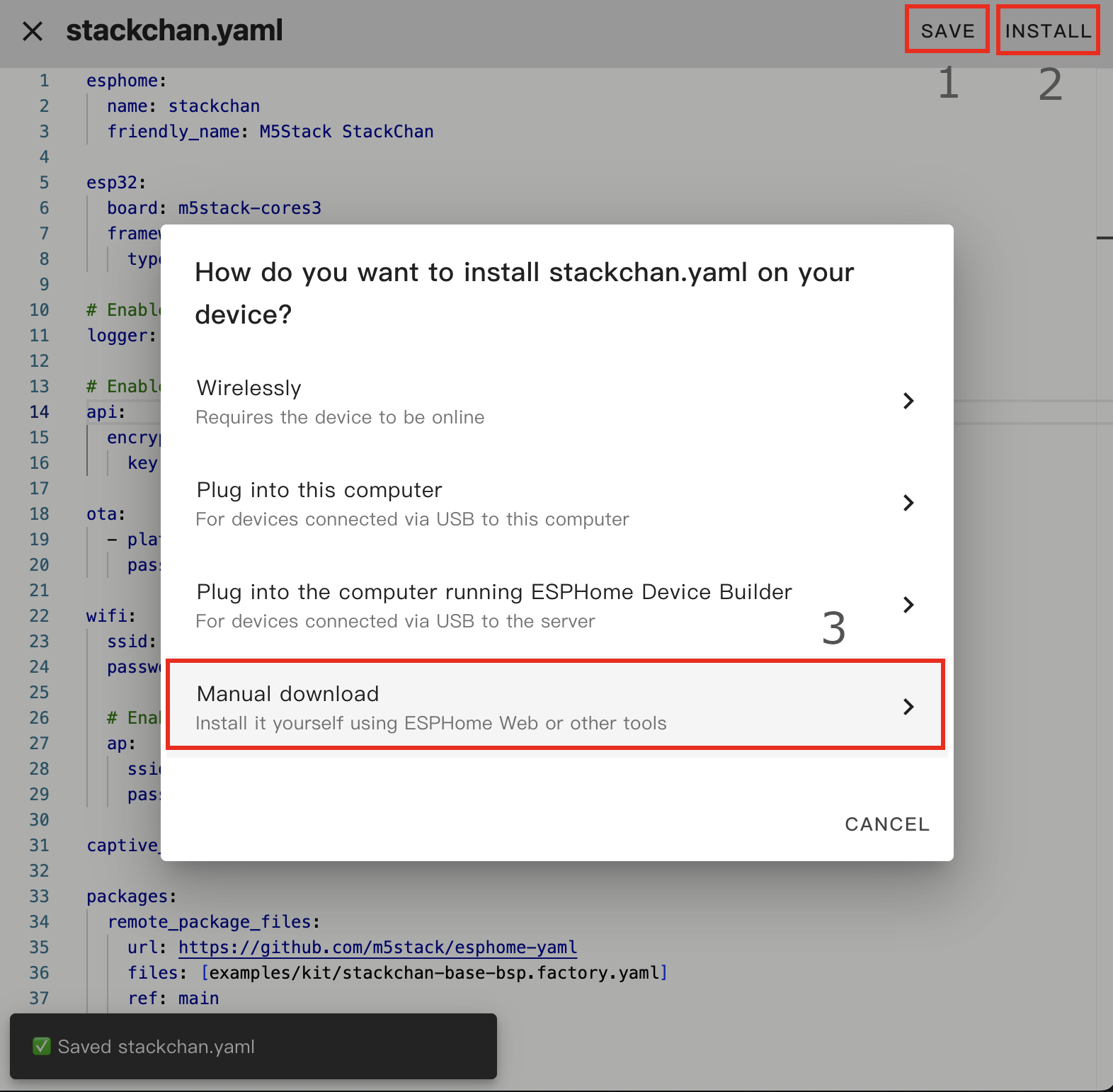 Connect StackChan to the computer via USB-C, hold the reset button until the green LED lights up, then release it to enter download mode.