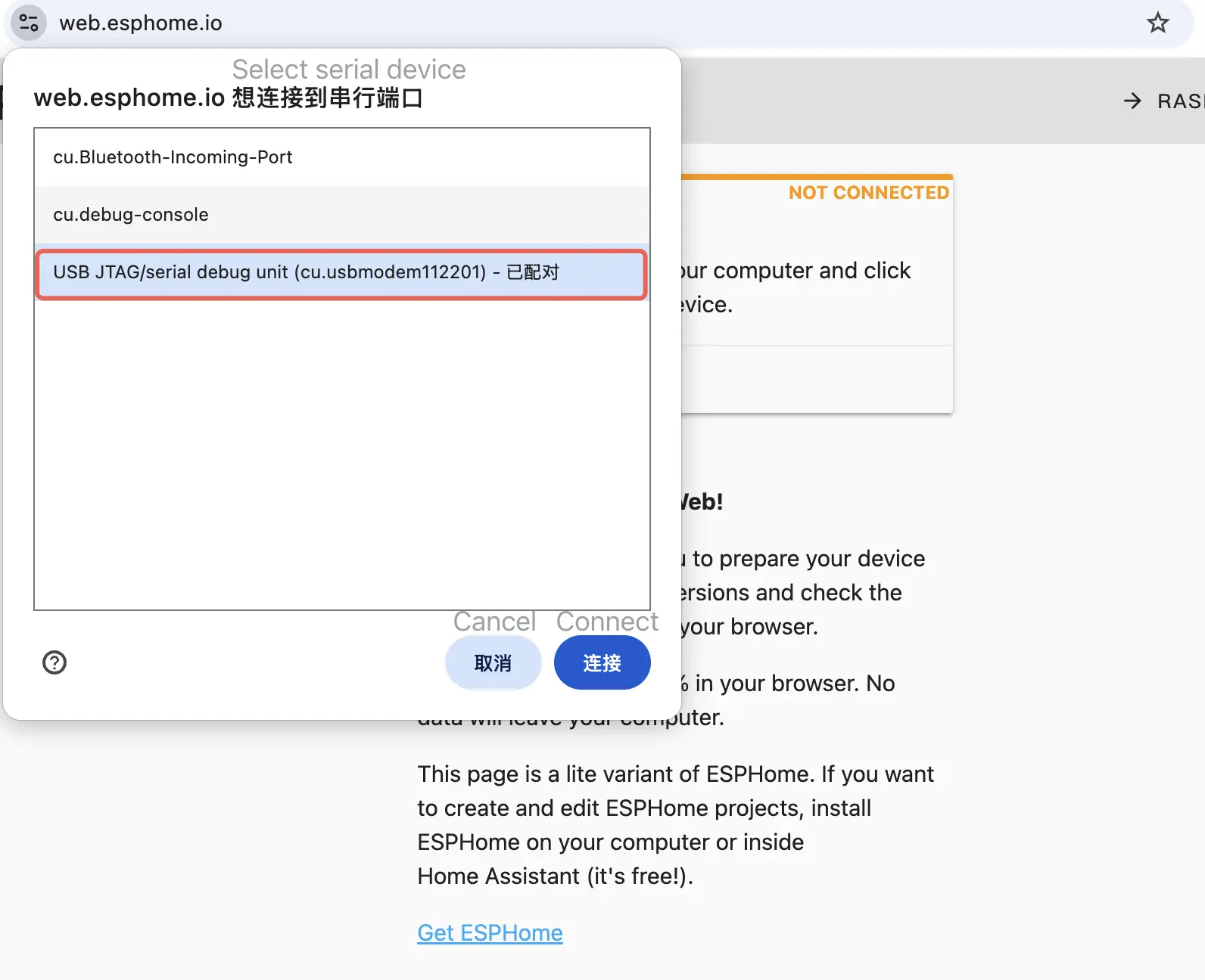 Open ESPHome Web in the browser and click CONNECT to connect the device.