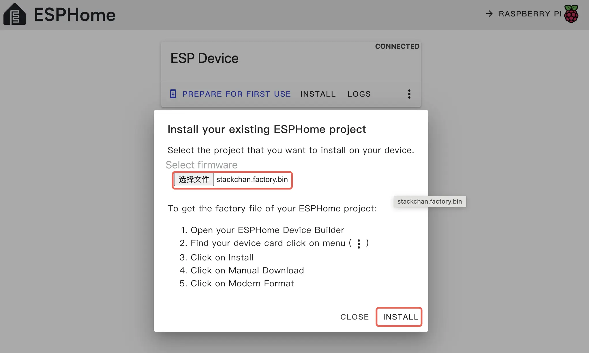 INSTALL, select the downloaded firmware, and click INSTALL again to flash it.