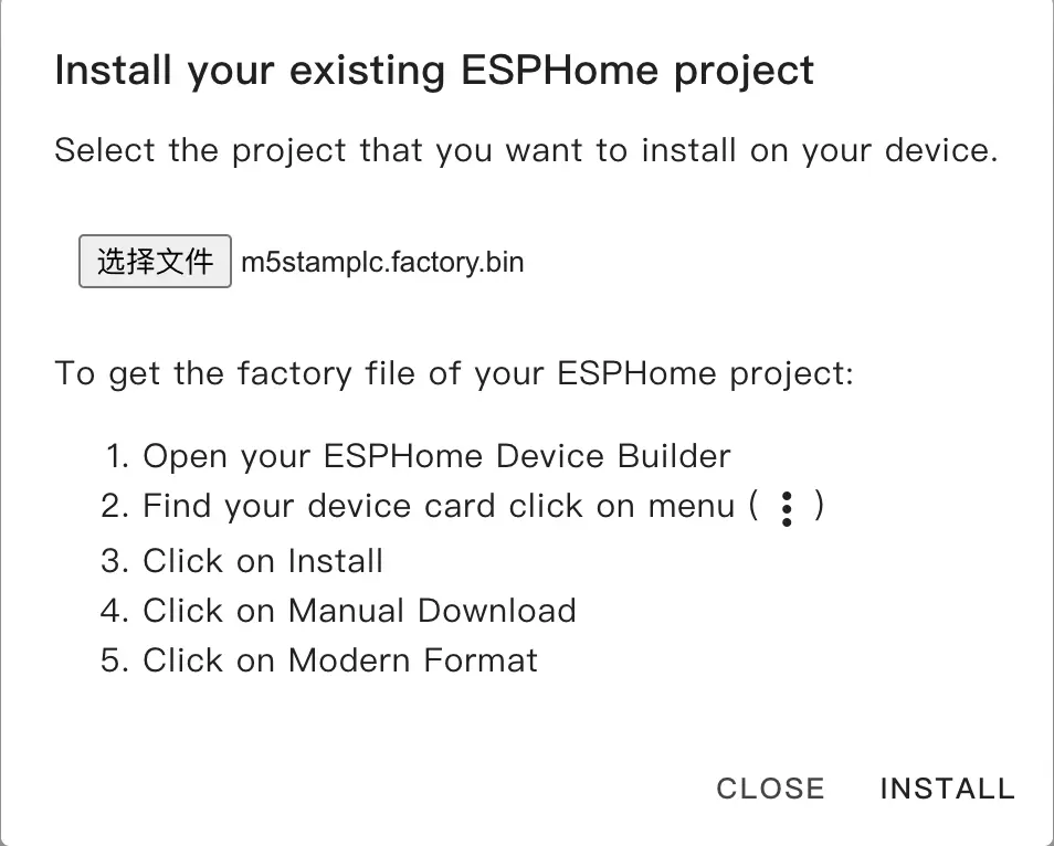 Click INSTALL, select the previously downloaded firmware, and click INSTALL again to flash the device.