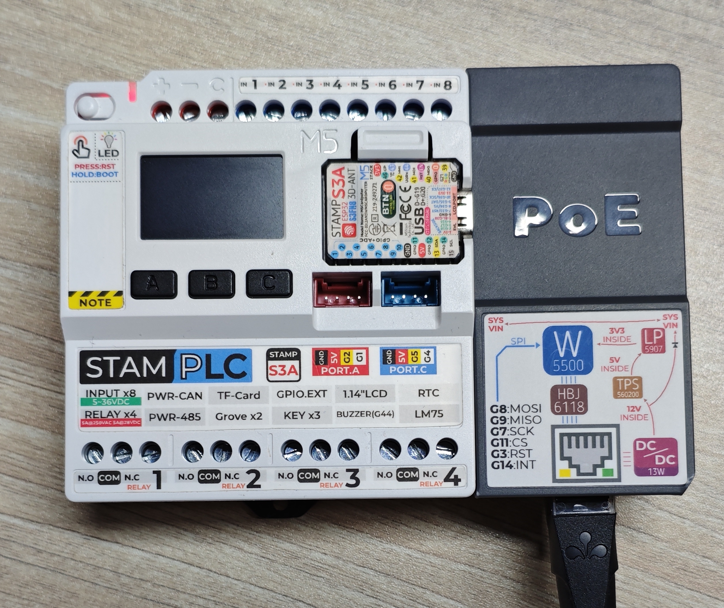 StamPLC PoE is an Ethernet control module designed for the StamPLC host. It supports PoE (Power over Ethernet) technology, enabling both data transmission and power supply through a single Ethernet cable. The module integrates a W5500 embedded Ethernet controller with a built-in TCP/IP protocol stack, providing 8 independent hardware sockets, a 10/100M Ethernet data link layer (MAC), and physical layer (PHY). It supports mainstream network communication methods such as UDP and TCP.
