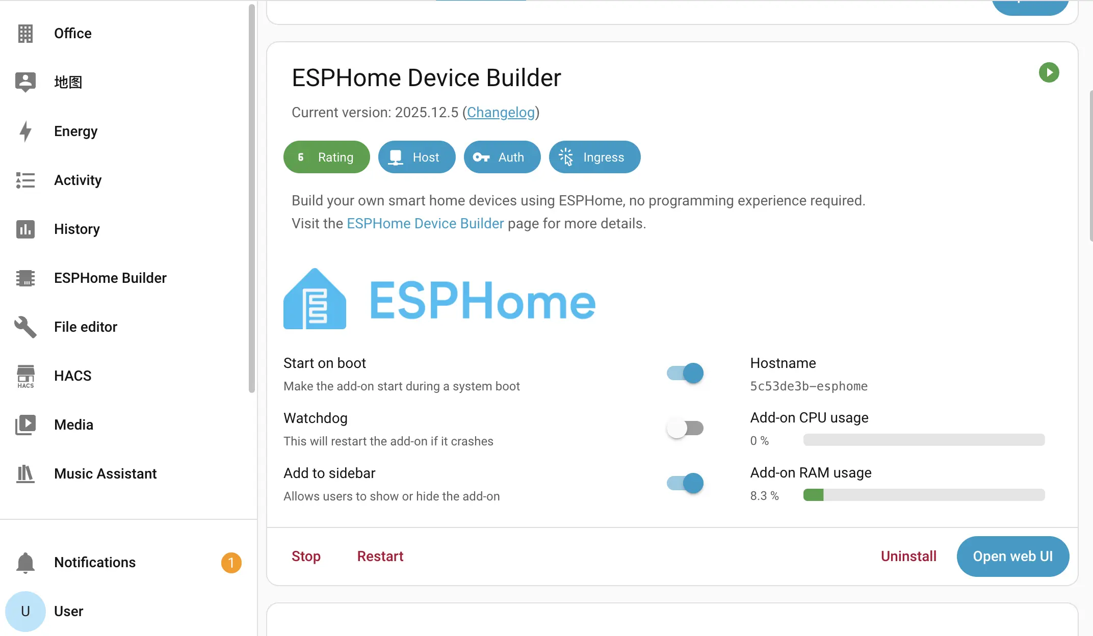 Settings -> Add-ons -> Add-on STORE, install the ESPHome add-on.Show in sidebar in the ESPHome management page to add it to the left navigation.