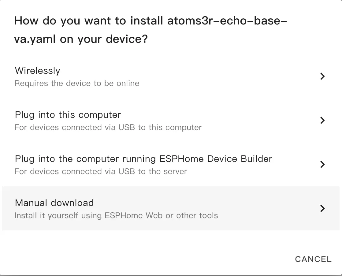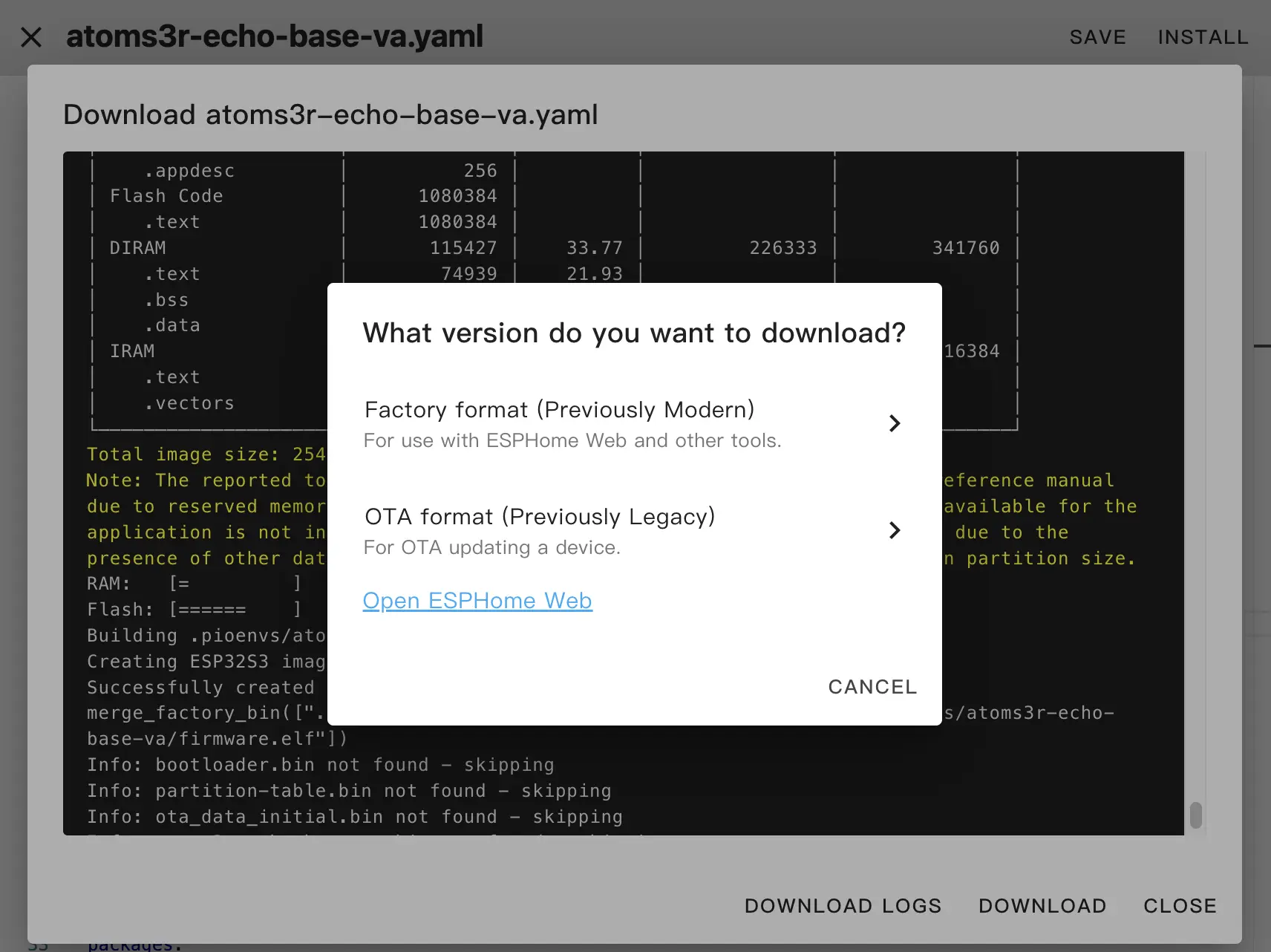Download and choose Factory Format (Previously Modern) to save the firmware locally.Open ESPHome Web to use the web flasher.