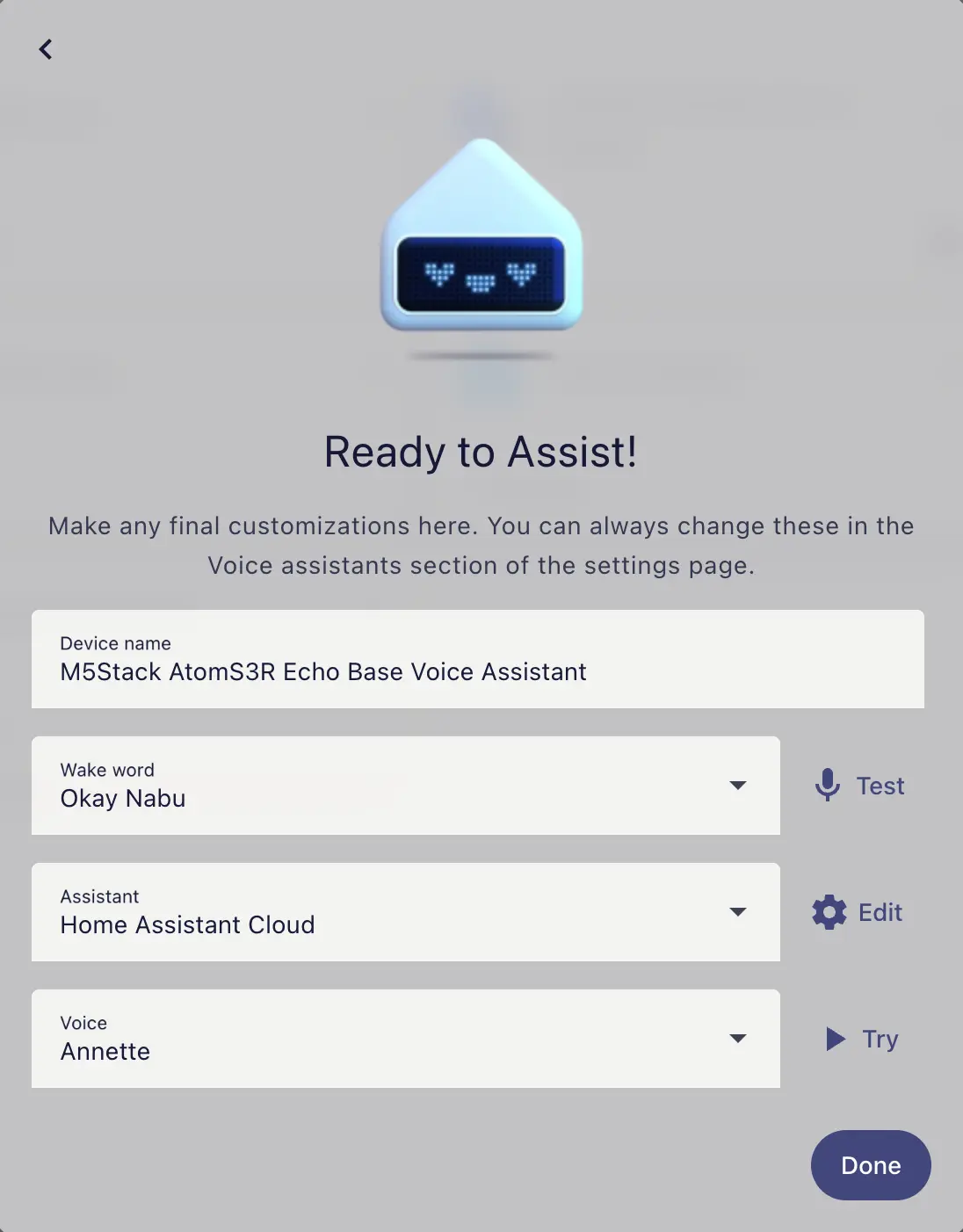 After adding the device and configuring the Home Assistant Cloud and Assist Pipeline add-ons (see the links in the preparation steps), you can wake the voice assistant using the wake phrase "Okay Nabu".