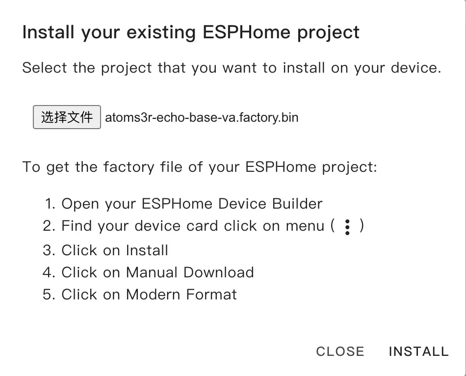 Select the previously compiled *.bin file and click INSTALL again to flash.