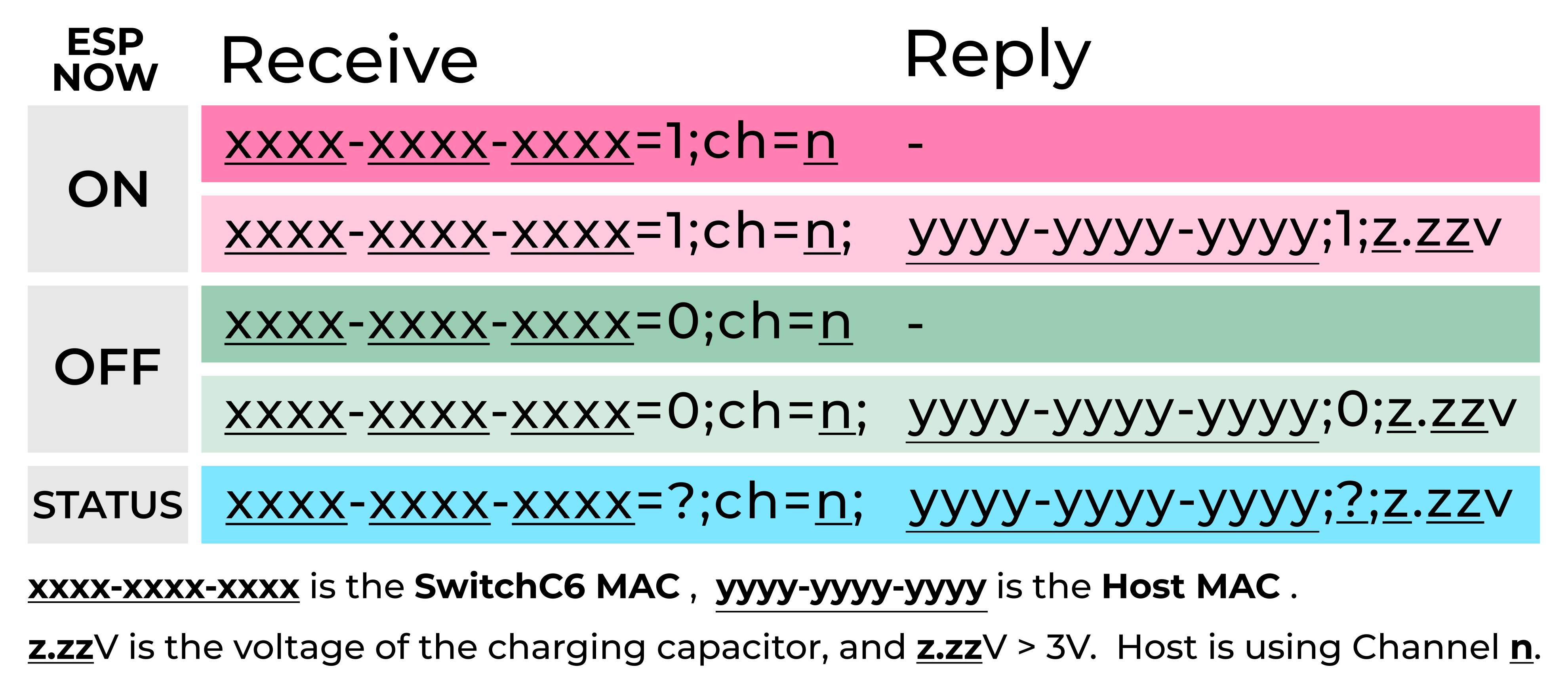• Short press once: Toggle the switch state, then broadcast status information (own MAC address, channel, new switch state, capacitor voltage, etc.).